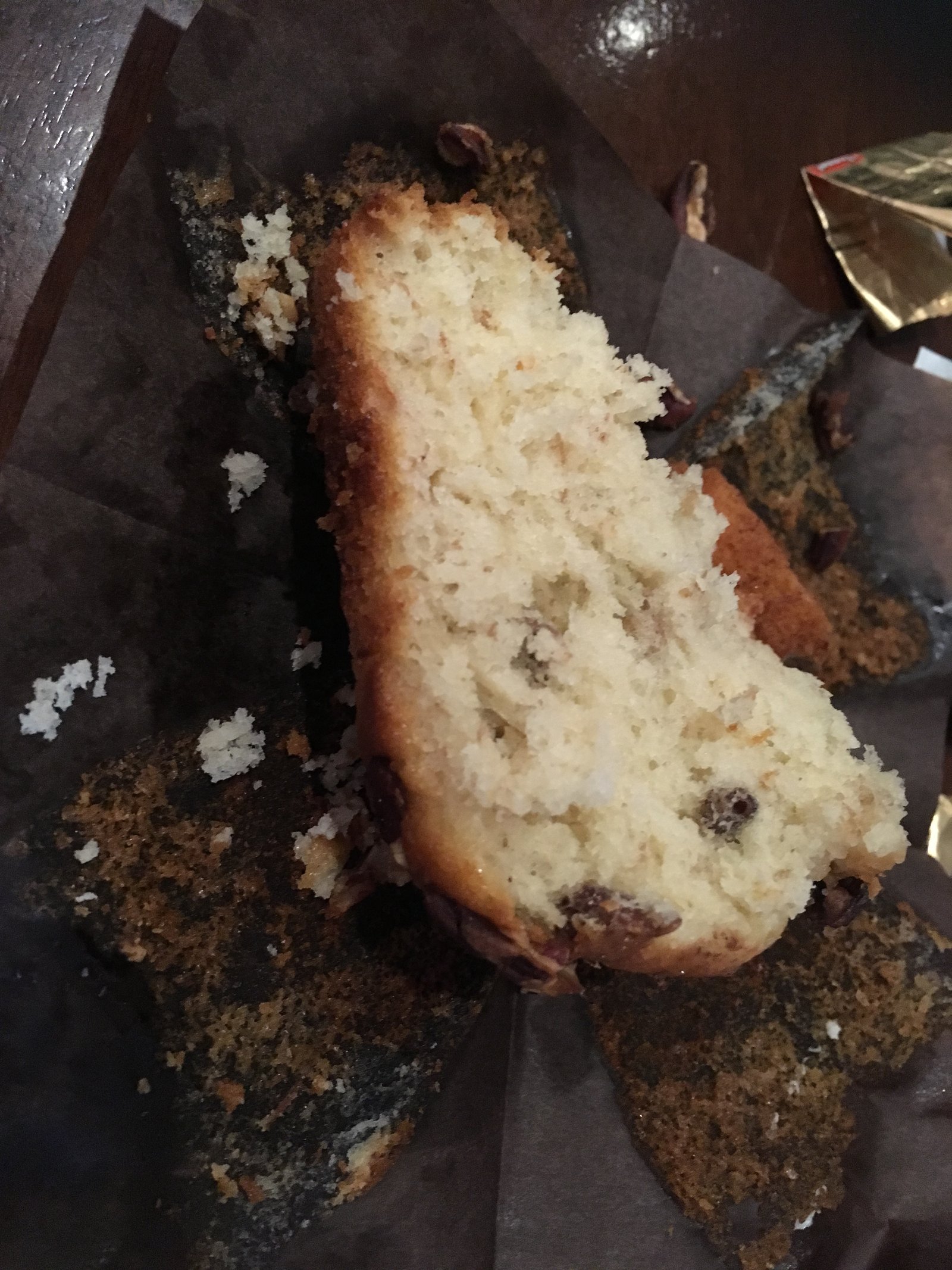 The banana nut muffin was really good; tall, banana fresh flavor and crispy pecans on top.
