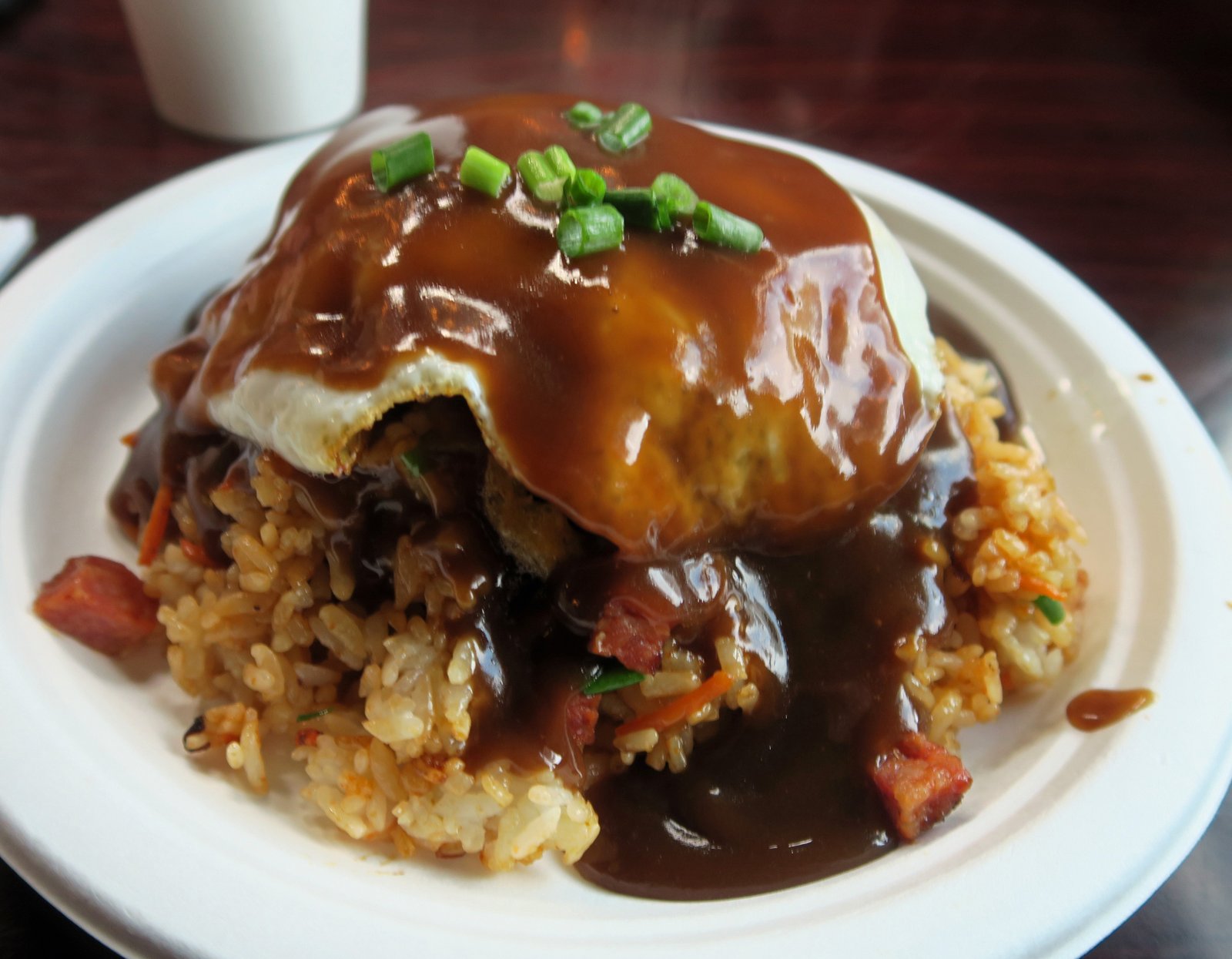 It was interesting to see that the outdoor area was pretty busy; at a few minutes past 7 on a Sunday morning. It looked like folks were having French toast and omelets. I had other things in mind. Since it had been nearly 9 months since my last Loco Moco, I decided on the Hilo Loco ($11), which is what I had on my last visit over three years ago.