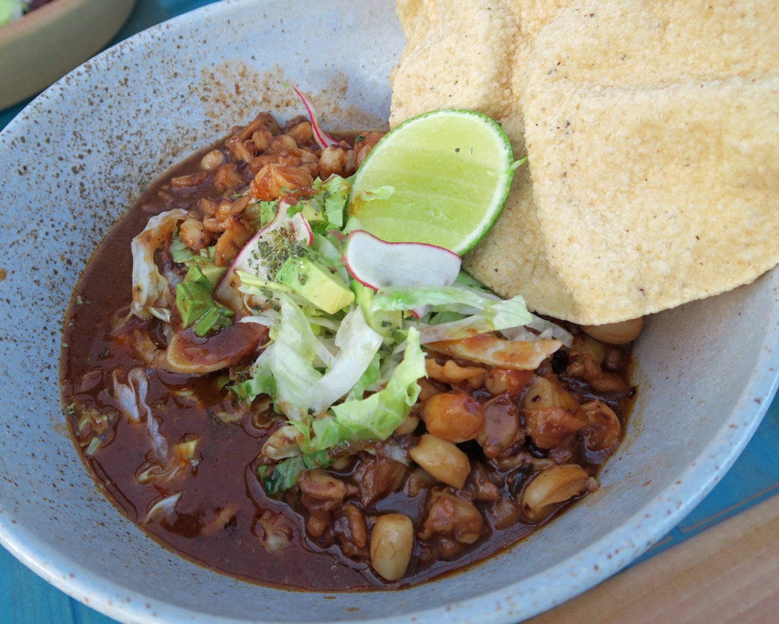 The bowl with the beans, pork, corn, radish, avocado, et al; is served first, then the broth is poured over at the table. This is hearty and all the various textures come through.