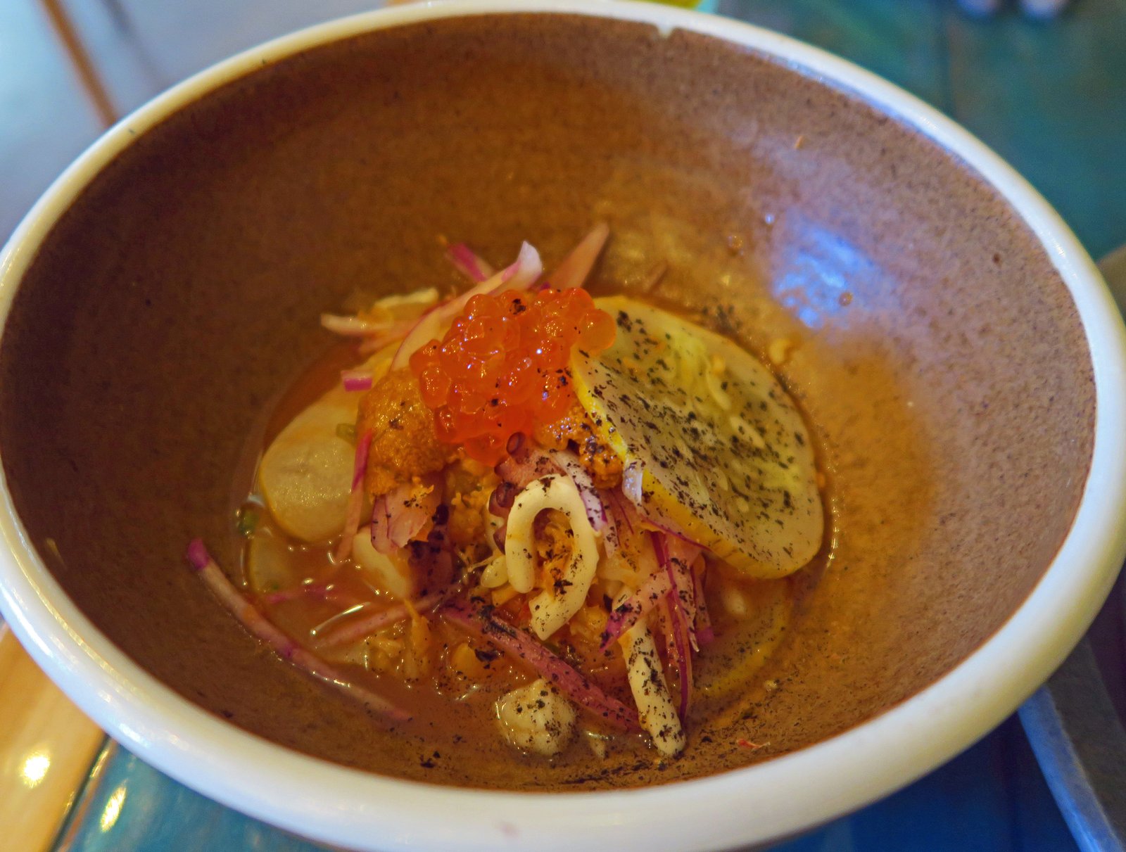 First off; this was a really tiny portion. Second, the trout roe was too salty, third the uni tasted a bit "off", and unlike the other octopus dish, in this it was quite tough.