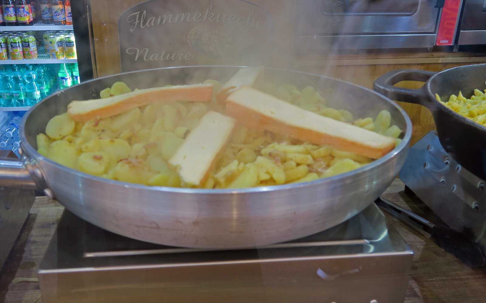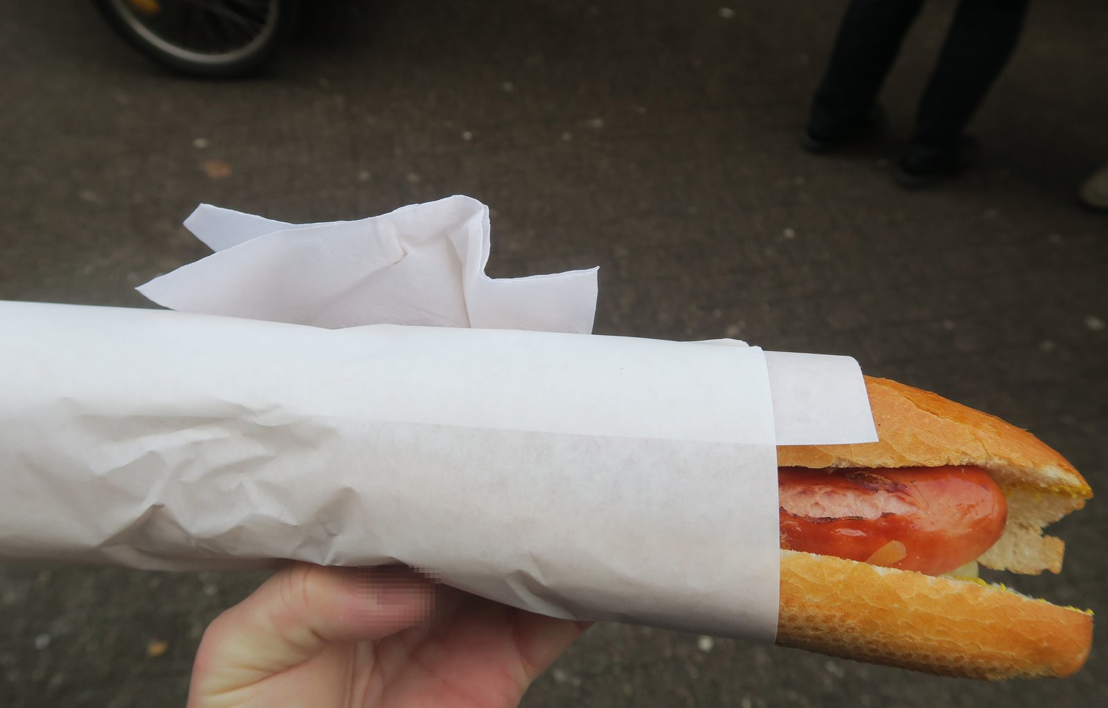 The guy working here was a hoot. After a good bonjour…..basically using up all the French I knew. I pointed to the great looking sausages with caramelized onions in the tray. He smile and asked me where I was from. I told him "America"; he then said, "good, you want zee hot dog?" He cracked me up! I ordered one; and he actually went ahead and made one up for me fresh. really nice. Before he handed the foot long sausage in a baguette to me he asked: "you want zee ket-chup?" I laughed and said "non merci monsieur – my friends from Chicago would kill me if I put ketchup on my hotdog!" He laughed and said; "so monsieur….you are purist?" And we both cracked up…..the sausage guy….and yours truly; the hot dog "purist"!