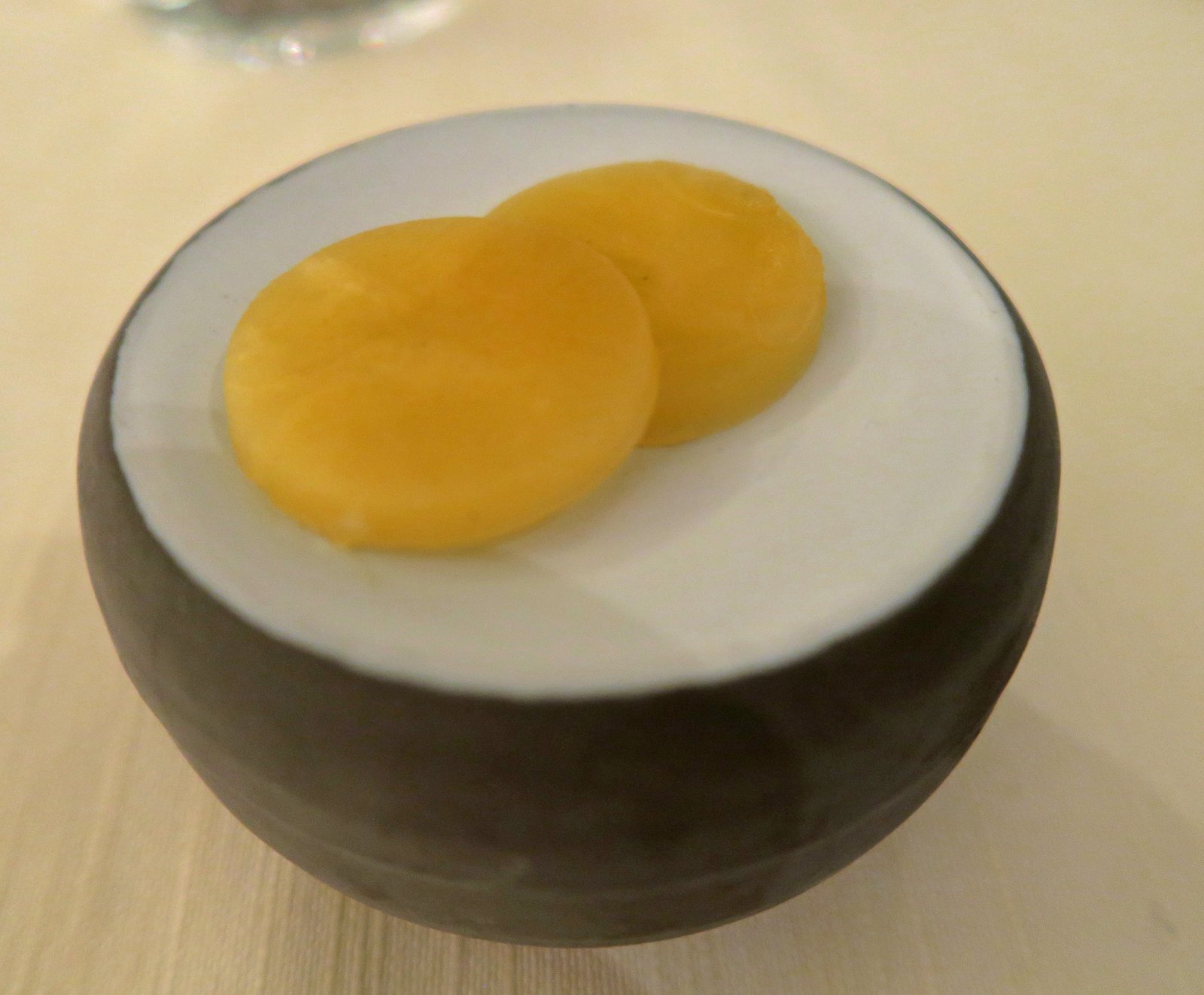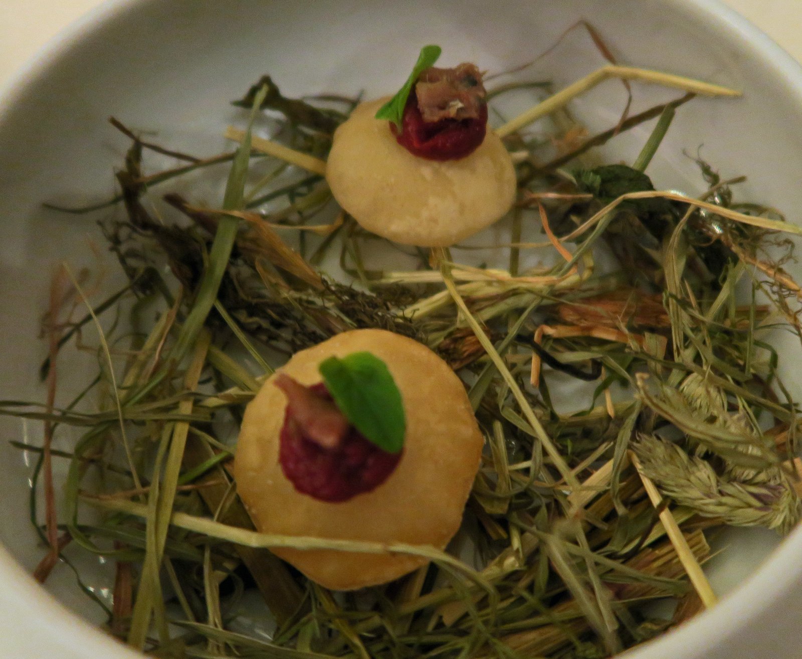 Starting with the Anchovy and Tomato. This amuse was wonderful; the savory-salty anchovy perfectly balanced with the sweet-tangy-acidic tomato paste.