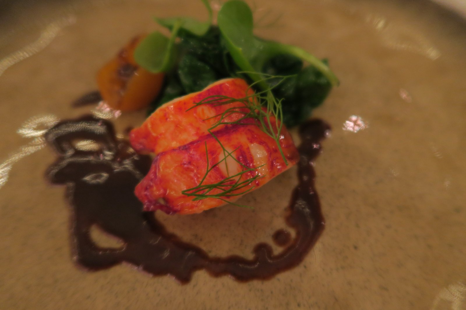 The wonderful buttery texture and mild sweetness of the lobster was the star of the Lobster, kumquat, and spinach, in red wine sauce.