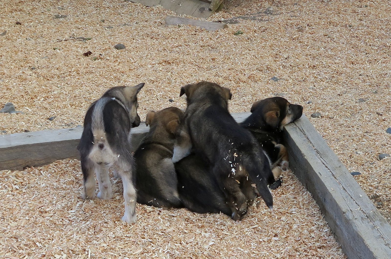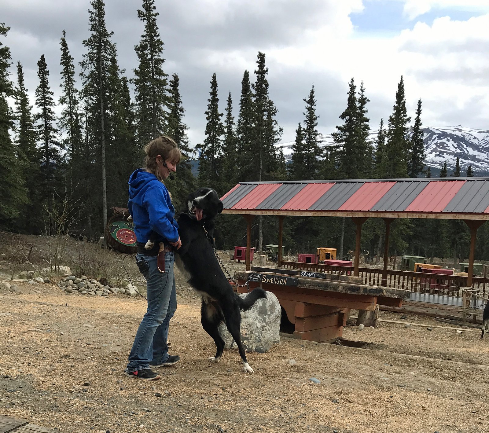 It was a nice, easy hike.We got back to the visitors center and headed off to the strip of tourist shops called "Glitter Gulch" (Nenana Canyon), yikes! We soon headed on out to a pick up spot for our next stop for the day. We'd made reservations to visit Jeff King's Husky Homestead. A mini bus came to pick us up and take us to Jeff King's Iditarod Training Center……I'm hoping you folks know what the Iditarod is. Jeff King is a four time winner of what is called "the Last Great Race on Earth". I was looking forward to seeing the dogs, the training, learning about life and preparation for the Iditarod, learning about the Alaskan Husky. All of which was answered. But first….some puppies!