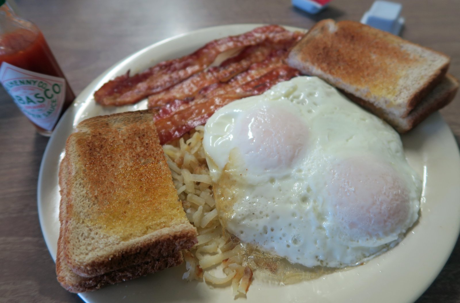Four bucks for two eggs with bacon, hashbrowns, and toast. Don't forget to finish your toast….Lucky doesn't like waste. Lucky sees everything. If he sees that you've finished your toast, he'll ask if you want more.