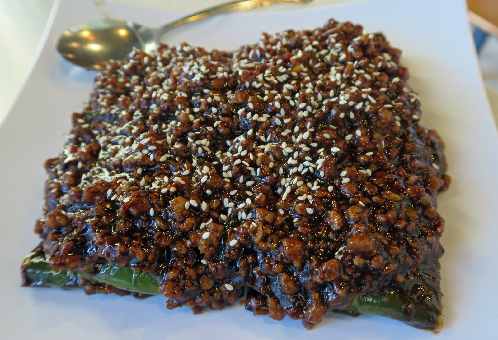 The mild chilies were nicely charred, but the sauce was way to sweet, obscuring the savory-fermented flavors of the black bean. The pork was on the chewy side and a couple of pieces….well, have you ever bitten into a piece of meat and felt like you got a toenail? There were several very hard, tooth chipping piece amongst the chewy minced pork.