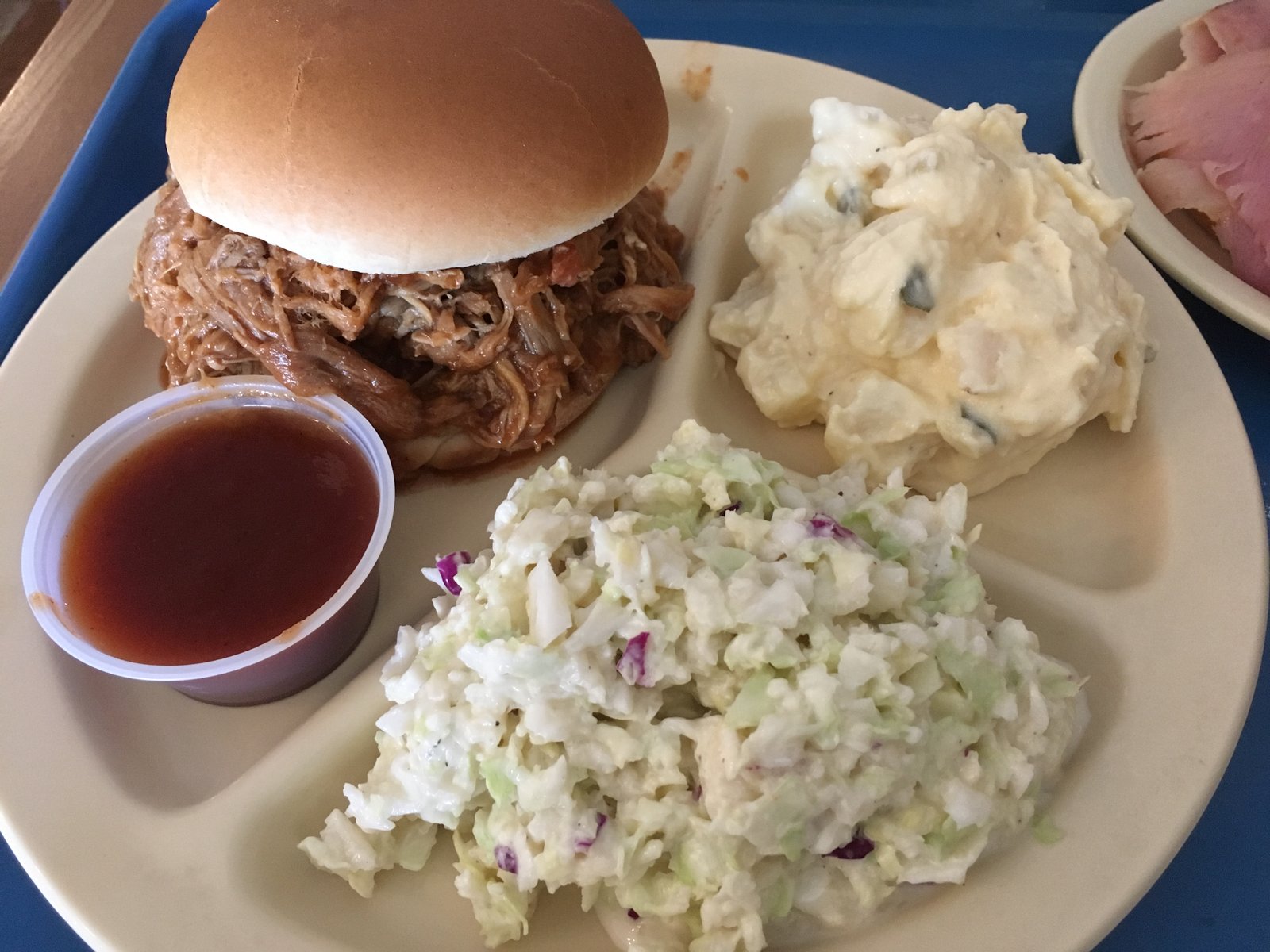 The pulled pork plate ($10.49) is a BBQ pork sandwich (sauce on the side; there is some sauce on the meat but I like to eat just the 'basic' sandwich first then add more sauce to the second half) and two side orders (slaw and potato salad here, but also choices of baked beans, macaroni salad and French fries). The BBQ here is "pit' style- slow and low heated oak wood smoking in a sealed above ground oven. The flavor is unique yet familiar.