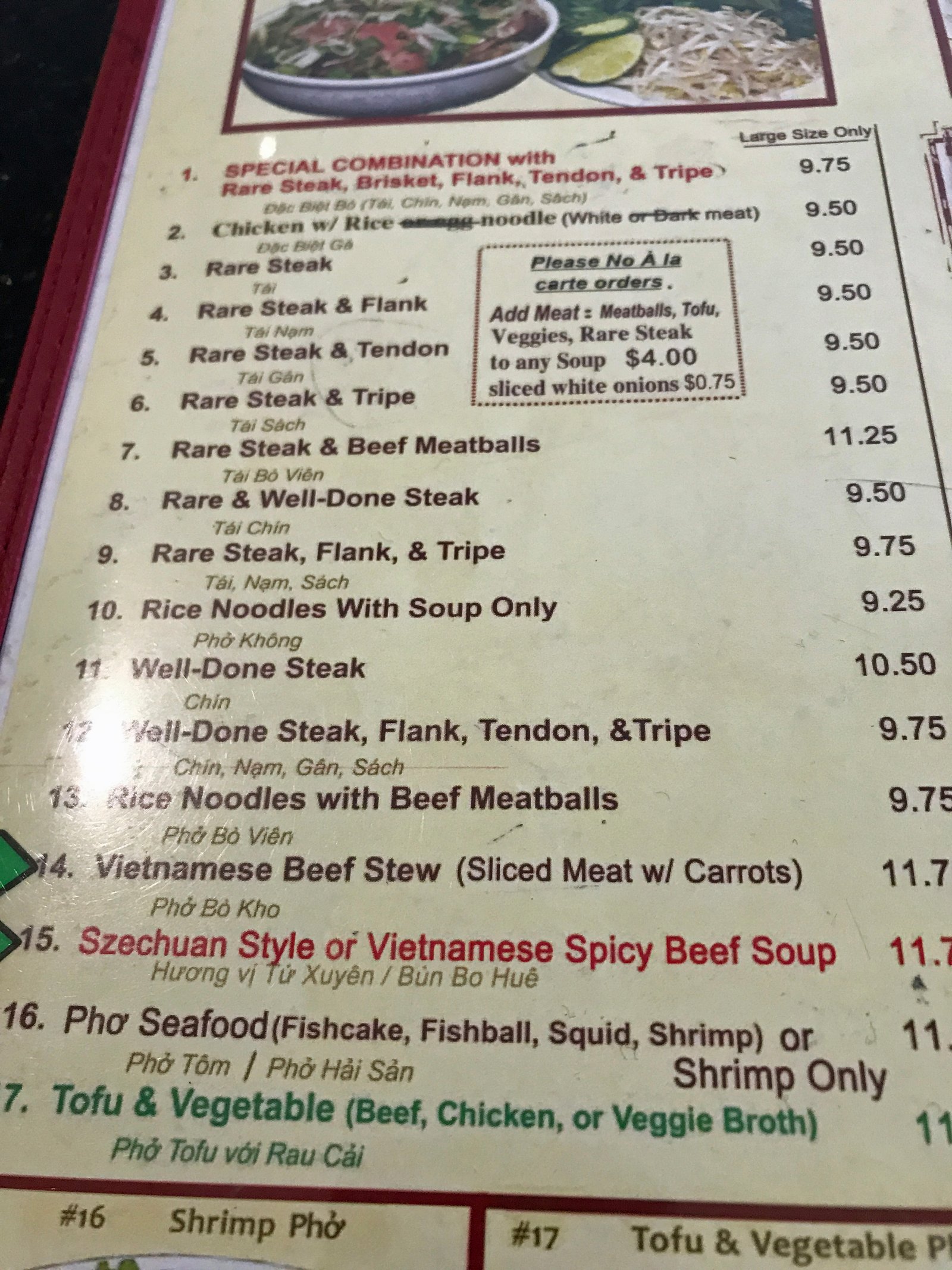 What I wanted to order was quite simple; well-done steak, flank, tendon, and tripe….except there was a problem; they don't serve tendon and tripe anymore. It's been replaced by meatballs. Ok, how about the bo kho….nope, that's off the menu now as well.