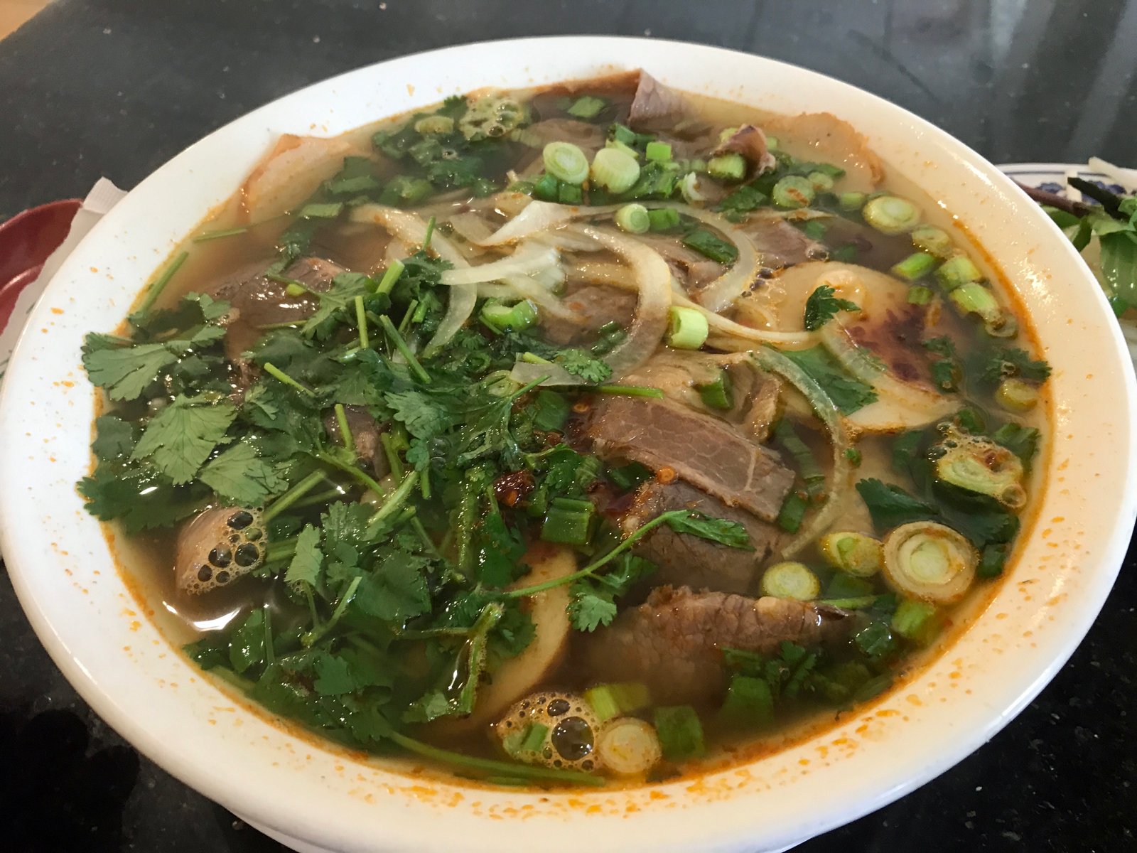So, I finally settled for the Bun Bo Hue….that would be the "Vietnamese Spicy Beef Soup" on the menu; not the rather strange sounding (in a Vietnamese Restaurant) "Szechuan Style Beef Noodle Soup" (well, maybe not since there weren't any Vietnamese working on this day as my order was called back in Spanish to the kitchen).