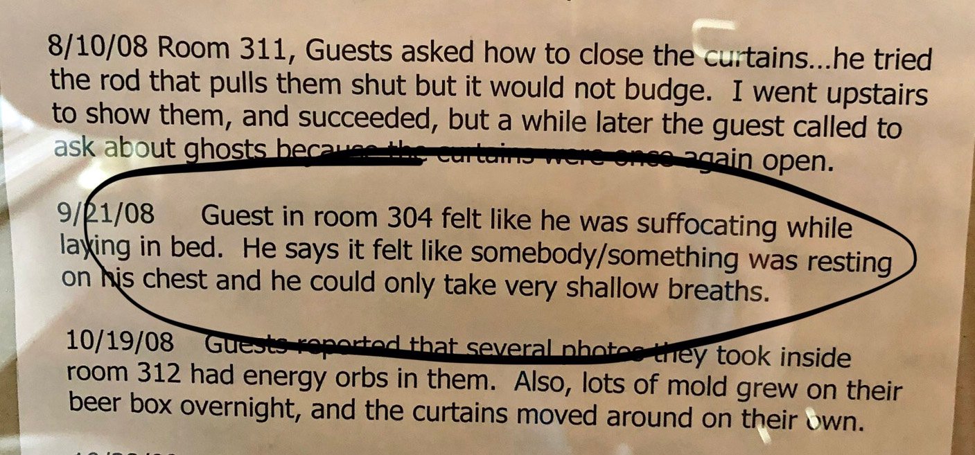 Some of them; like "lots of mold grew on their beer box overnight, and the curtains moved around on their own" kind of made us laugh….."Guest in room 203 came to the front desk to request a different room. The previous night the light in the bathroom kept turning on by itself and he could hear laughter and smell tobacco smoked from that room. He was not disturbed by this presence, but preferred a "less active" room so that he could sleep through the night." Yeah, for real….