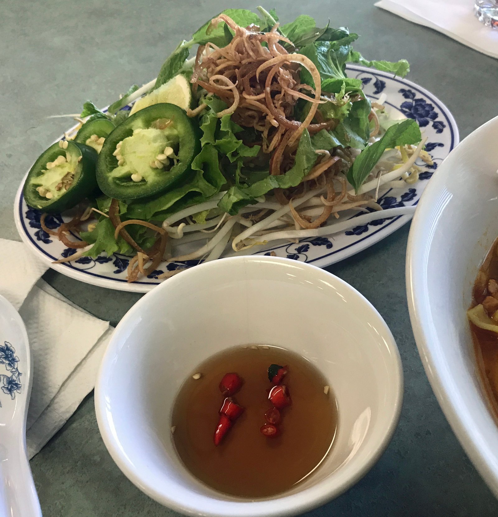 The broth wasn't bad; it had a nice tongue feel, though it was on the "sweeter" side. I made good use of the nuoc mam to bump up the flavor.