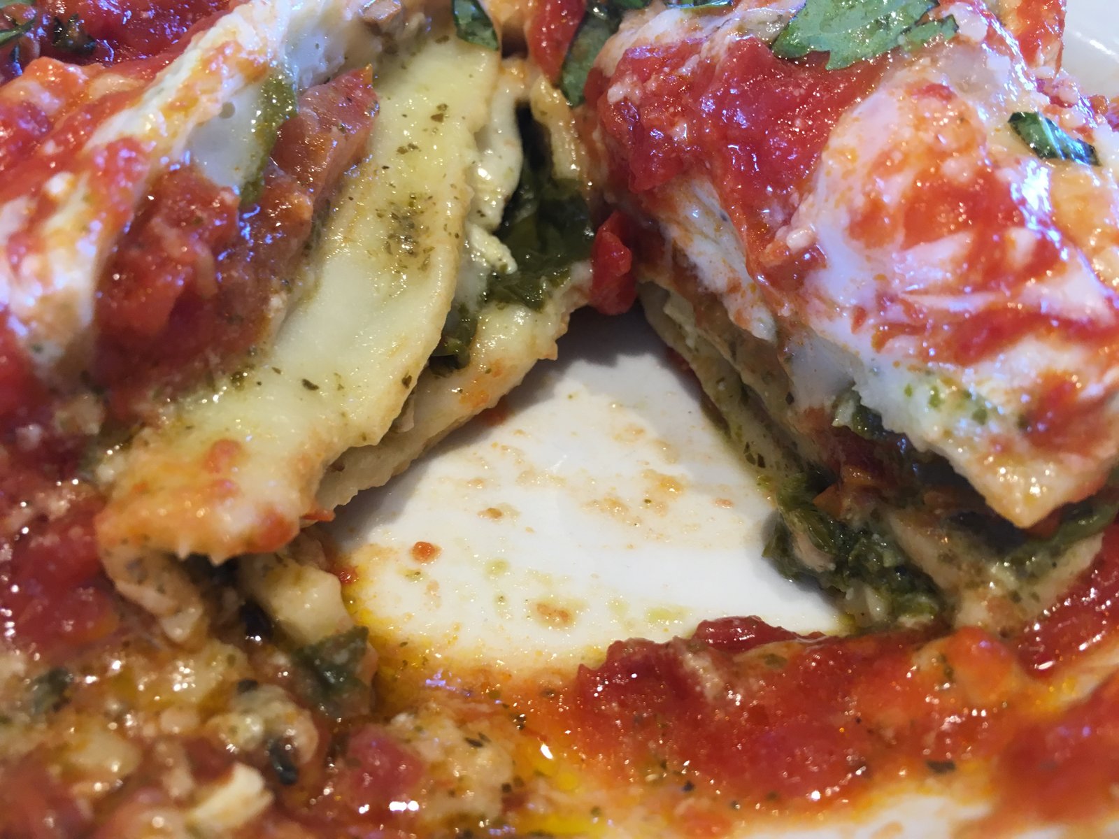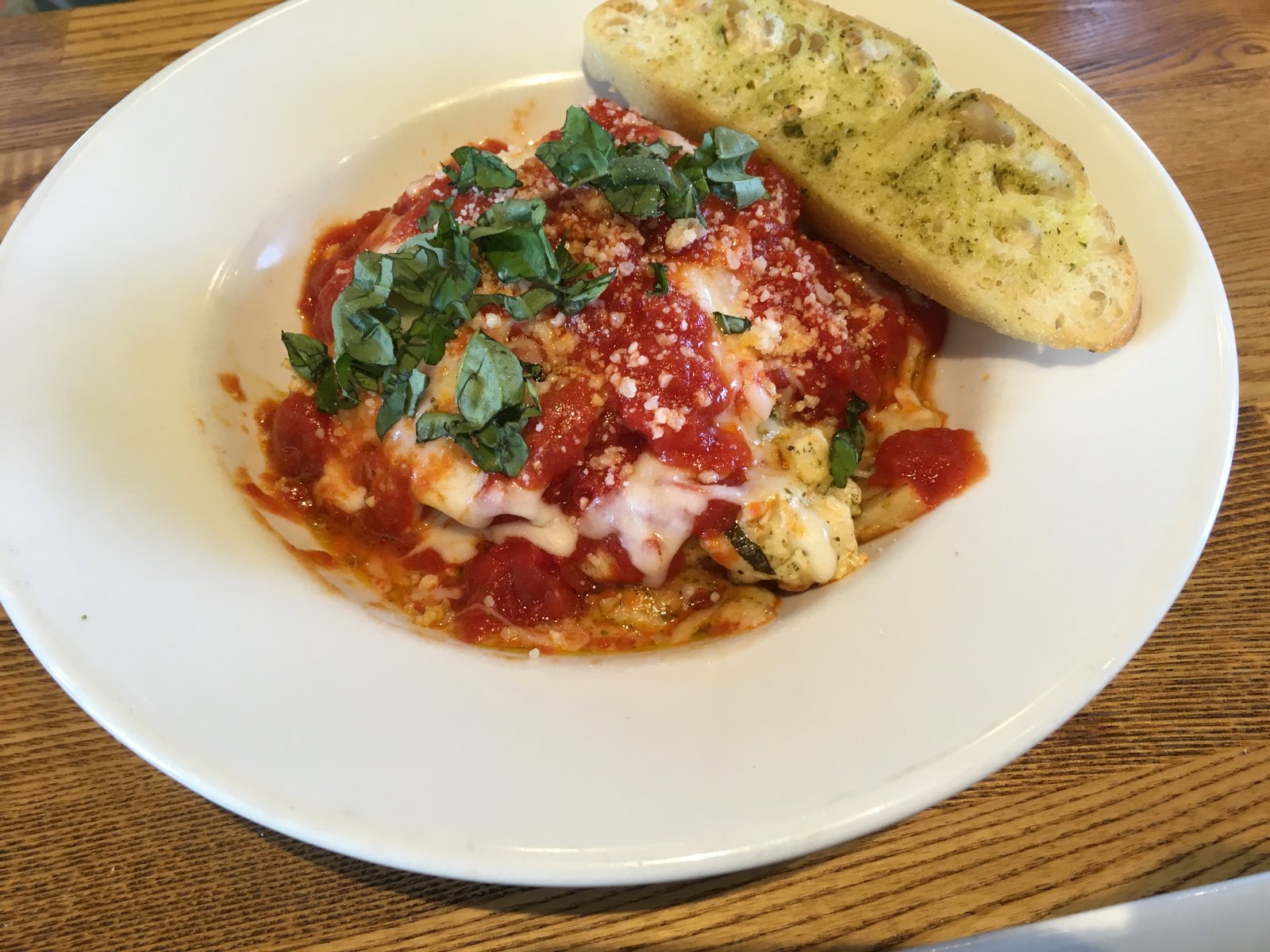 In this case, four cheese ravioli ($13.95) which had craft pesto and was topped with marinara and mozzarella. The pasta, cheese fillings, pesto, marinara and even the side of toasted garlic bread were each distinctive in fresh flavors. This was a filling meal…yet we wanted more.