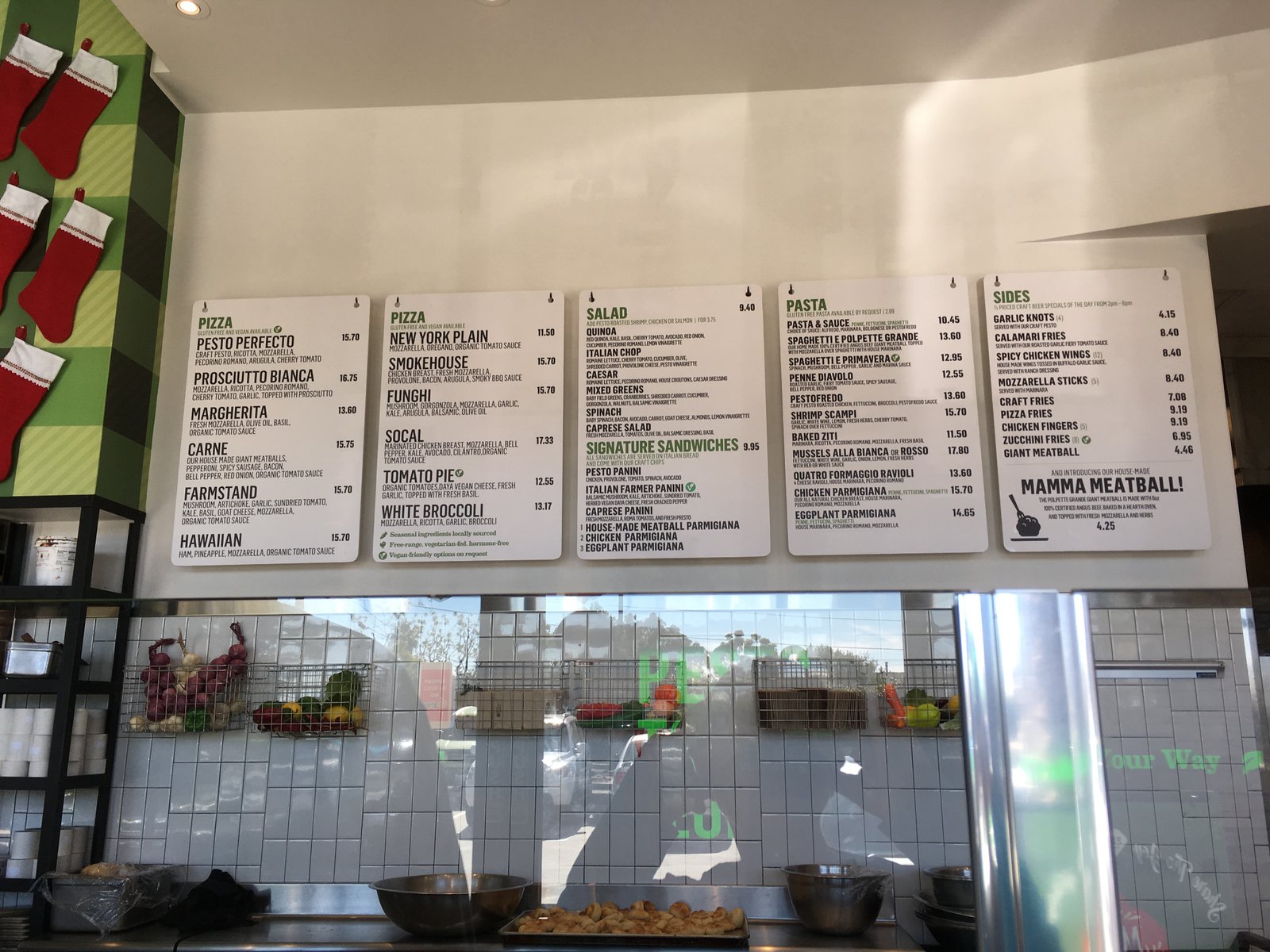Customized, wood fired oven pizzas have been a restaurant phenomenon since about 2014. I've written two posts about Pieology and one post about Blaze. Pesto Craft Kitchen took over what originally was the location of Social Life Neapolitan Pizza in 2016. Pesto offers more than customizable pizza and salads.The menu is visible when you walk in (this is an old photo with old prices because I apparently could not take a clear picture of it in the last year). (Use THIS link to see current prices on the website)