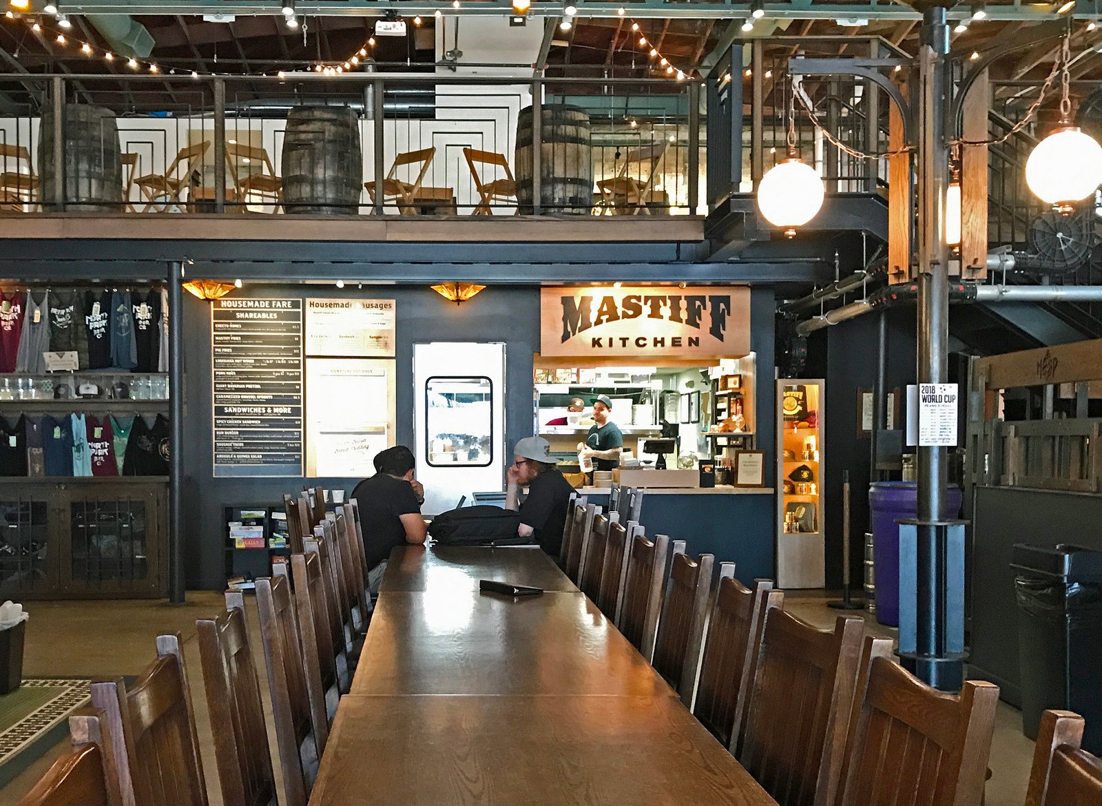 We both really like the space; high ceilings, you hang out with the beer tanks. Mastiff Kitchen is located at the rear of the place. You order and pay for your food there; then head on over to the bar to order your beverages.