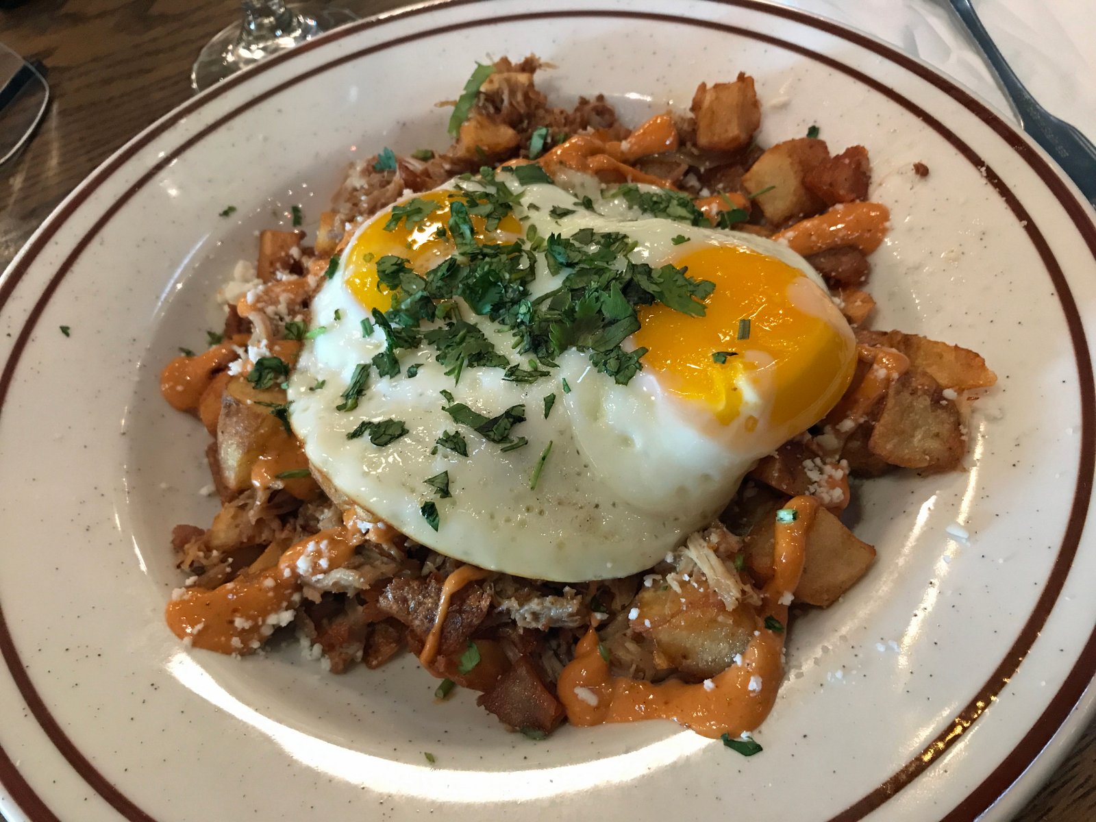 I decided to do this by chance; removing the items I didn't think I'd like (I don't like sweets and decided against anything too "simple" for some reason), then removed the Benedicts, because I'd just pass out after that. By coin toss, the Hungry Man Hash ($13) won out. Looking back, had I stared at that menu enough, the hash would have seemed very close to the "pig fries" and I might not have chosen it. But I did.