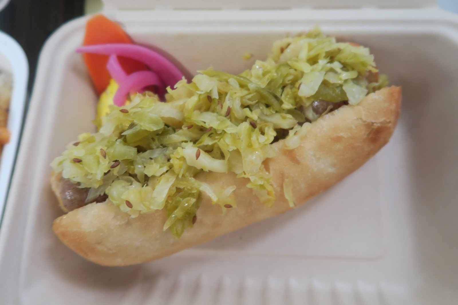 Though Mastiff's sausages are quite popular; I wasn't too impressed with this as a whole. The sausage wasn't hot and was sort of flaccid, it was very mild in flavor, there was little color on the sausage and the sauerkraut was also very mild, lacking in a nice slightly funky fermented flavor. I guess all of that sauerkraut in the Czech Republic and Charcroute in Alsace might have ruined us. The roll was on the chewy side for my taste. Granted; there was about a five minute wait from when this arrived on my desk and my call finishing; so it definitely wasn't sitting around.