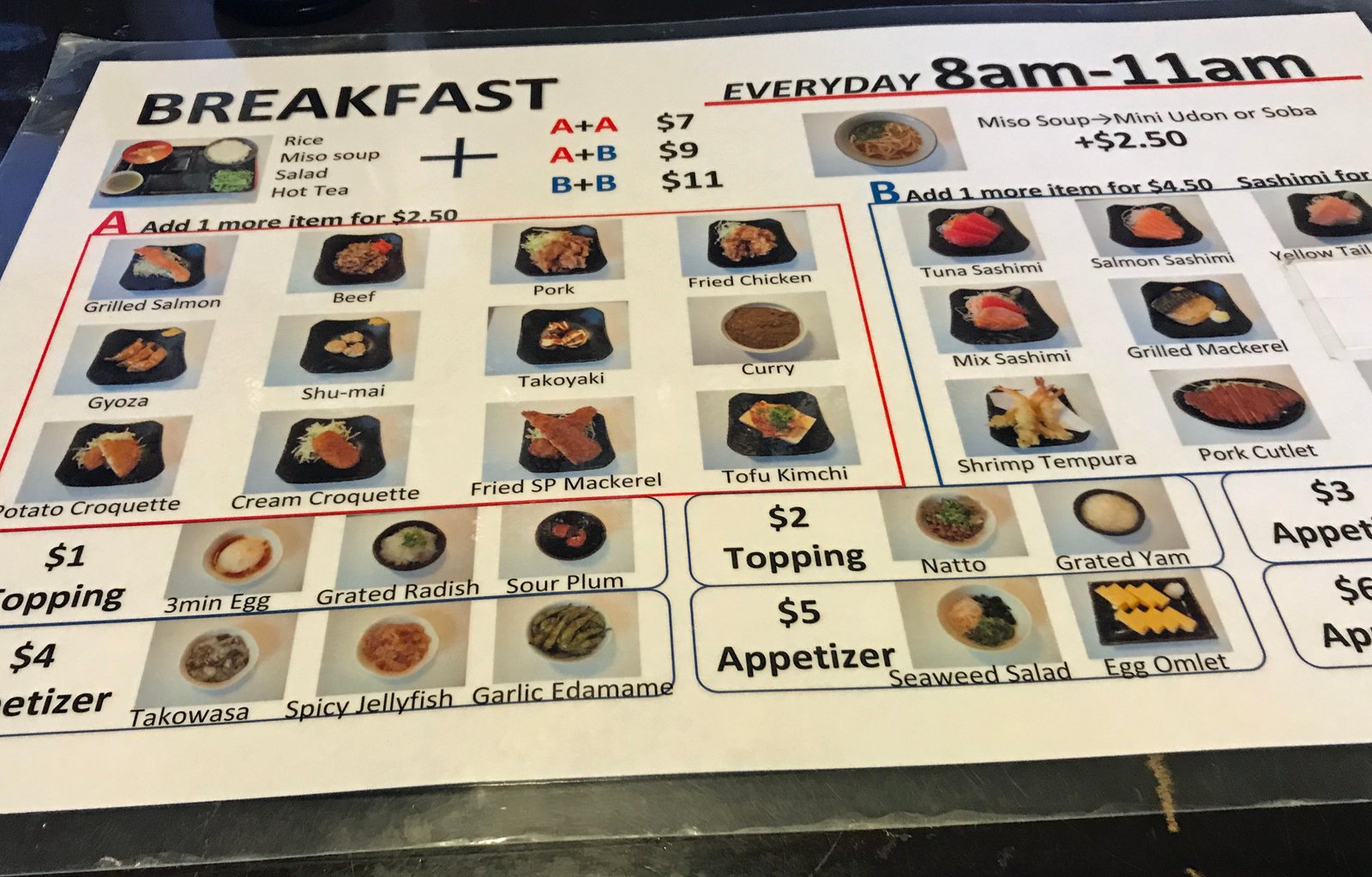 And while I do enjoy the Japanese Breakfast here there have been changes over the last couple of years; on the good side; you can now get Japanese Breakfast everyday from 8am to 11am. On the bad side; and this has been true for a while…..you need to order 2 items from the entrée category. Kind of a bummer; because I really wanted natto-egg-tororo.