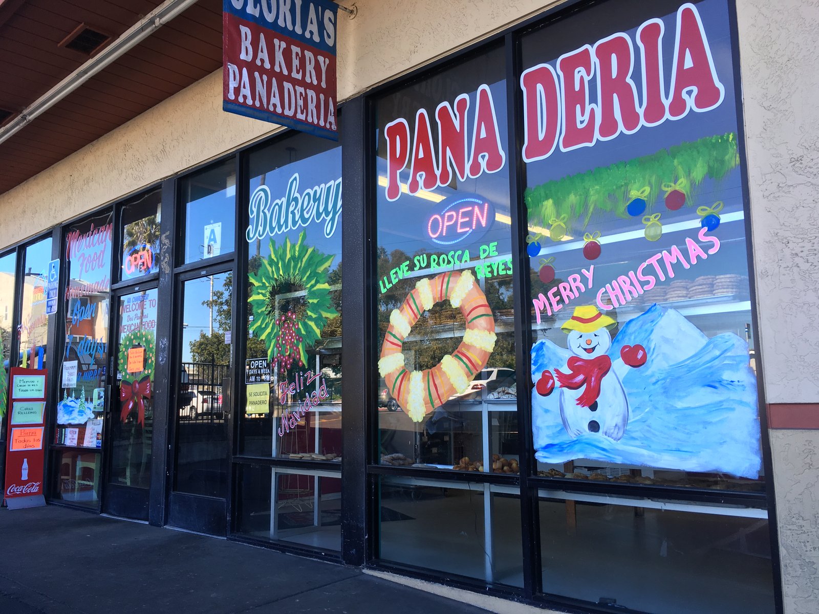 Within some of the above linked posts there has also been mention of Rosca de Reyes, a traditional Mexican bread shared on the 12th night after Christmas (Epiphany, January 6, Feast of Three Kings), usually while taking down Christmas decor. (In France, the traditional bread is Galette de Rois). cc and I did a small 'food crawl' the other day and stopped at three South Bay bakeries. All of the bakeries had beautiful window art advertising the upcoming holiday.