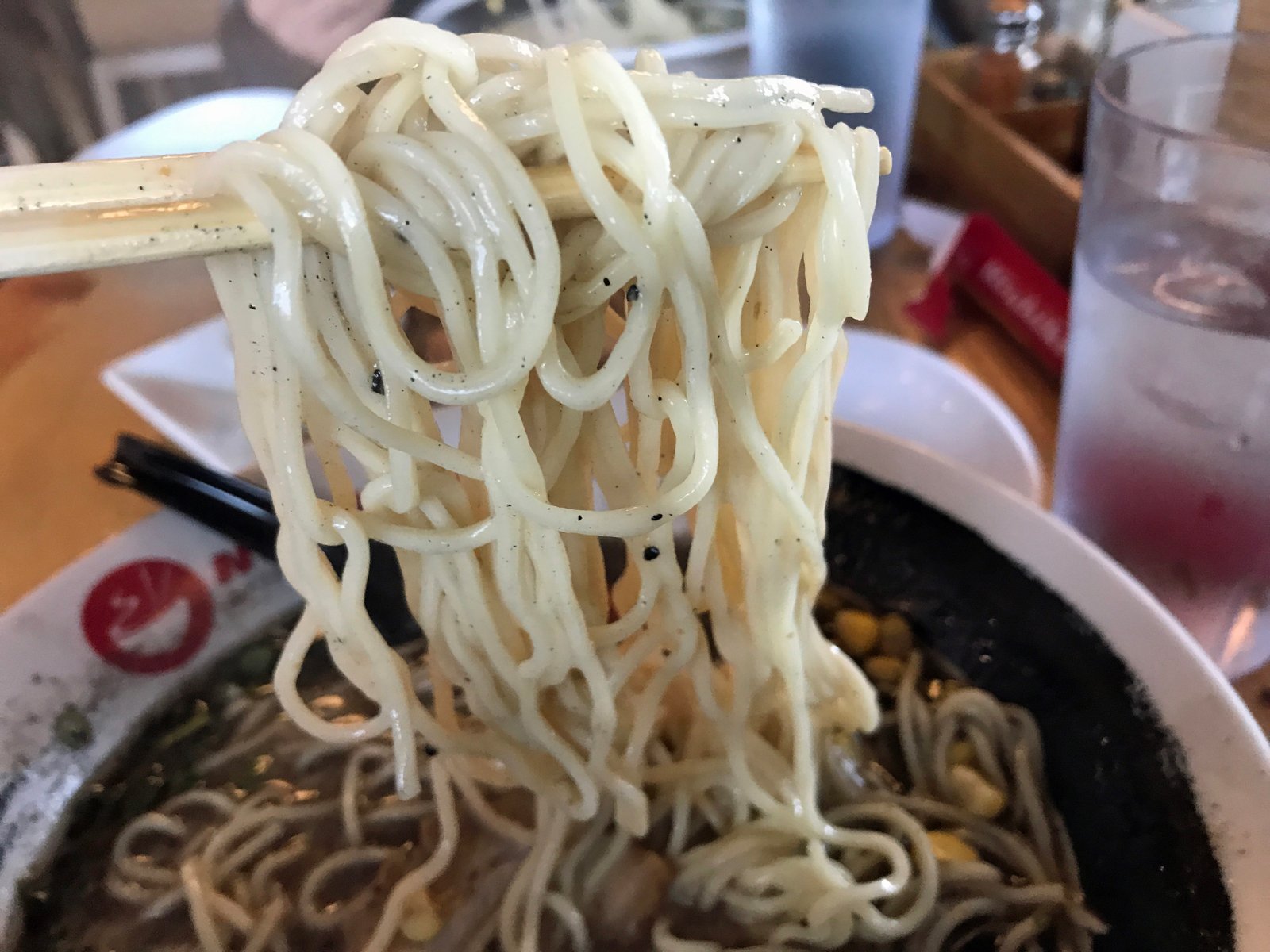 This looked very rich, almost greasy, but it was strangely not. You got a hit of garlic at the front end; but not much other than a bit of pork-poultry….the broth lacked the tongue coating richness I anticipated, it was almost weak, somewhat anticlimactic you could say. The temp was also on the colder than I prefer as well. The noodles were over-cooked for my taste and a chashu tough. I did enjoy the sweet crunch the corn brought to this bowl and the egg was perfectly boiled and not cold.