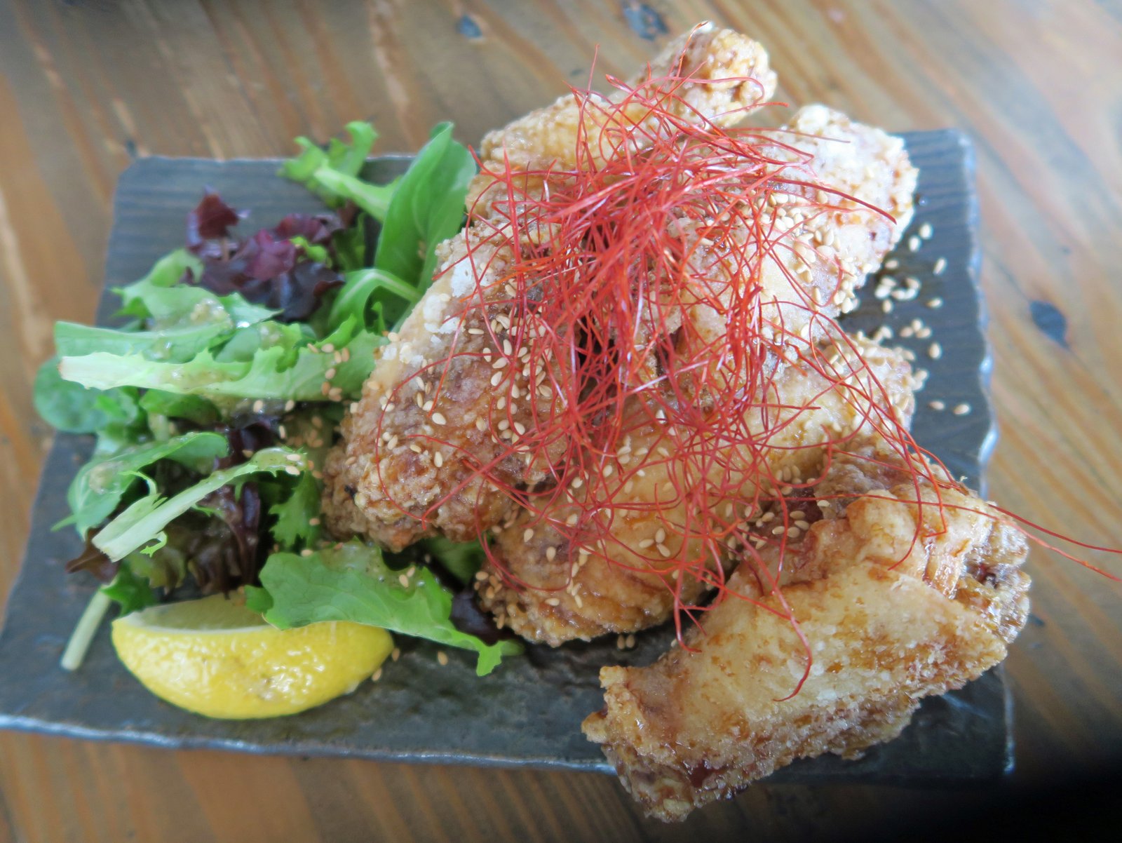 Decently, though not evenly fried and the flesh was on the drier side. The wings weren't evenly glazed with the sauce and was really too sweet. It definitely needed that kick of black pepper and more soy sauce, garlic, ginger juice, you name it. You can tell by how light the wings are in color; this needed more….