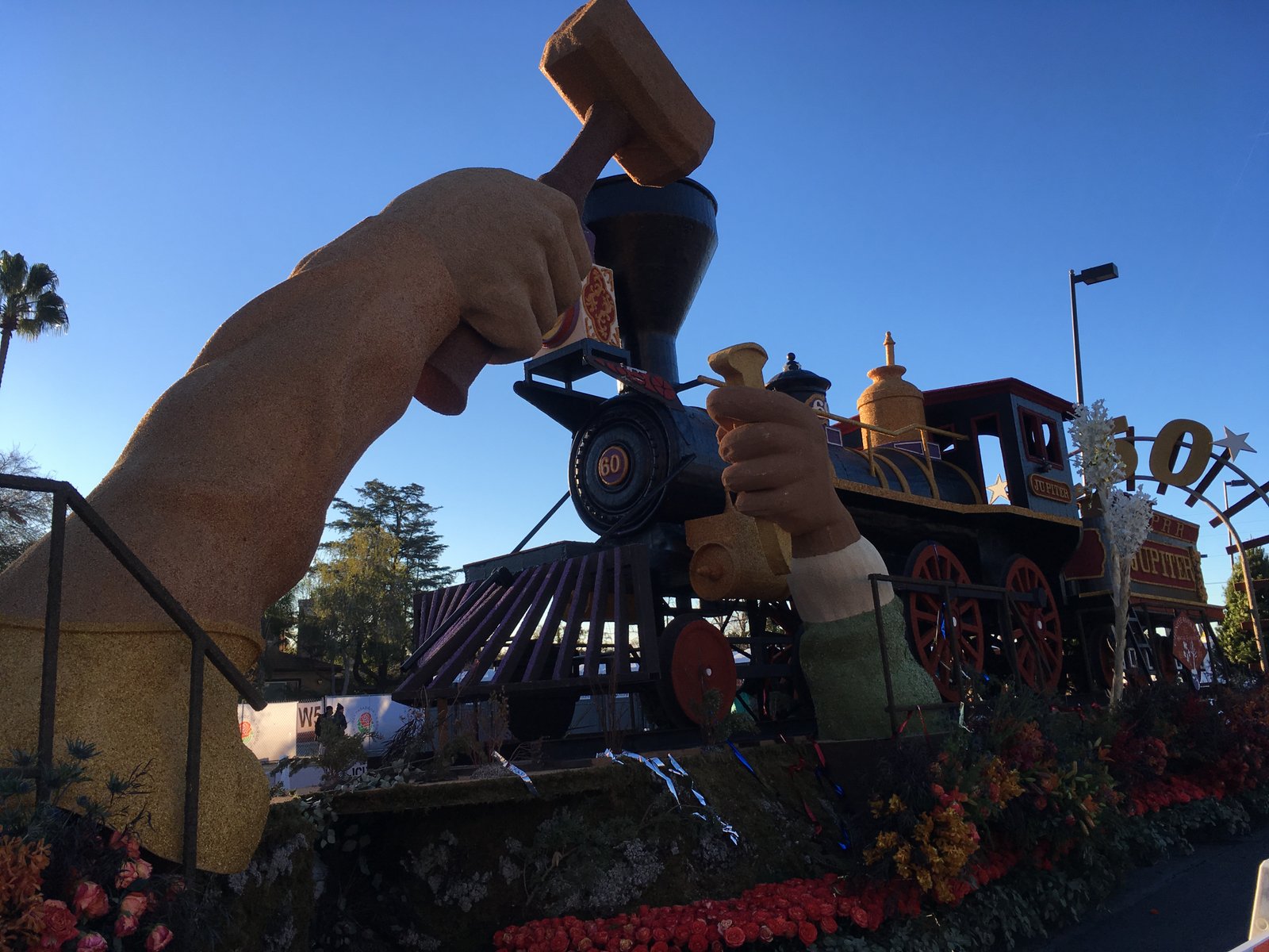 There was a small fire on board the longest float entry this year (Link to story), disrupting the end of the parade. The float was saved because of good preparation (you know, all of those Road Tests I post about have one of the tests the ability for the entire float to clear off and out in 45 seconds). This entry from the Chinese American Heritage Foundation, "Harmony Through Union", depicting the final nail joining the Transcontinental Railroads (the "Golden Spike") was on display at the Showcase