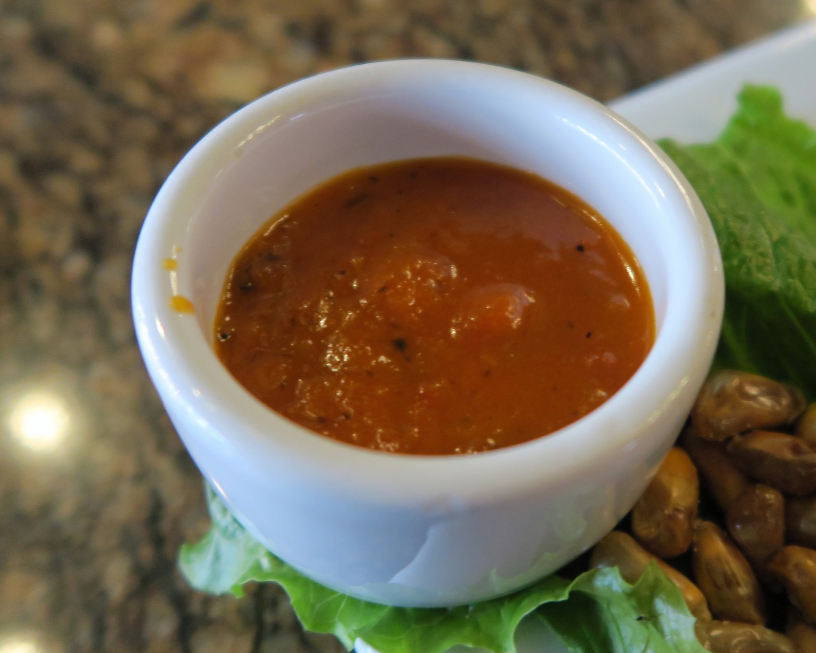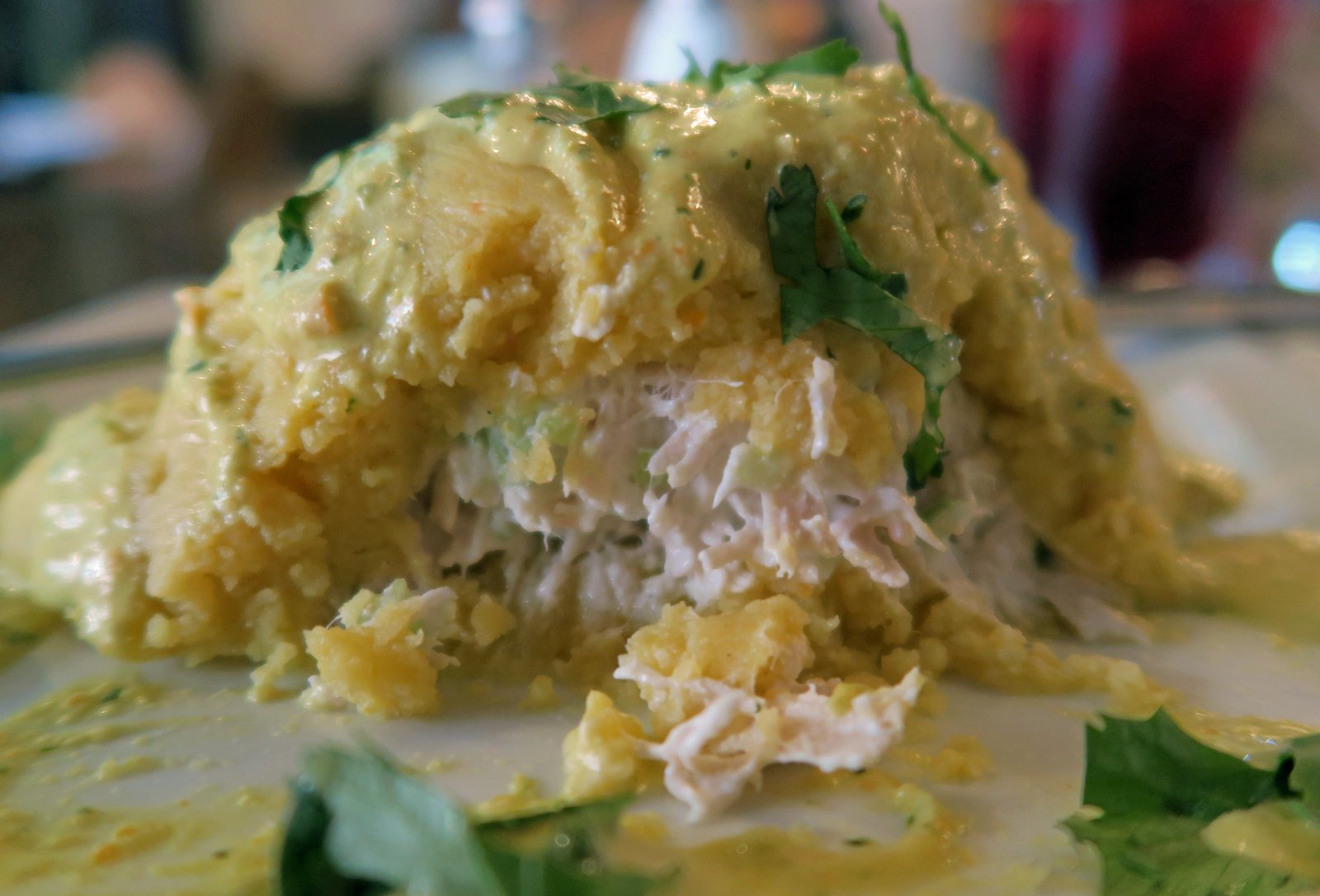 The sauce again had a good amount of spice. It was a bit too cold, the potatoes were on the mealy side. I like the potatoes in my causa to be moist and slightly creamy, this more mealy. The chicken filling had enough celery, but way too much mayonnaise for my taste. Lots of chicken though. Not my favorite version…..though it was quite hefty.