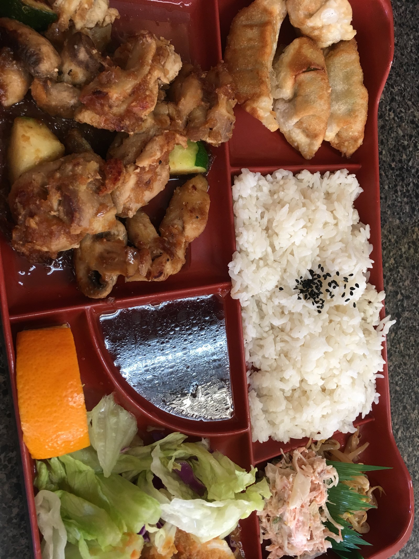 The window next to the entrance not only has a large menu, but the shelving underneath has a display of four specials for that day. On this day, the ginger chicken with fried gyoza Bento box ($8.25) was one of the specials. The dumplings can be steamed or fried; the top right corner has two small 'salad' sides- one of soy marinated bean sprouts and the other a salmon based chilled salad. The regular salad has a fresh ginger dressing and the ginger chicken was juicy (dark meat) along with mushrooms and zucchini. A hearty lunch.