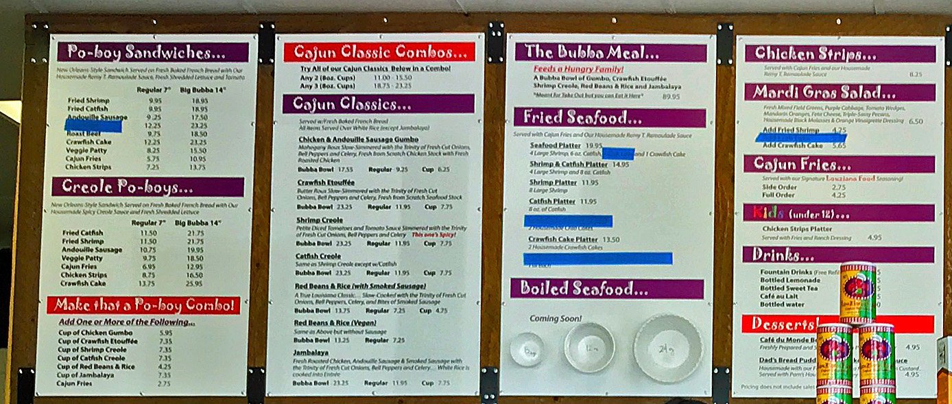 The folks here are always quite welcoming and the menu; while priced on the high side for stuff served in Styrofoam, has all the standards from po-boys to gumbo. In terms of Creole versus Cajun; the restaurant clearly calls itself Cajun.
