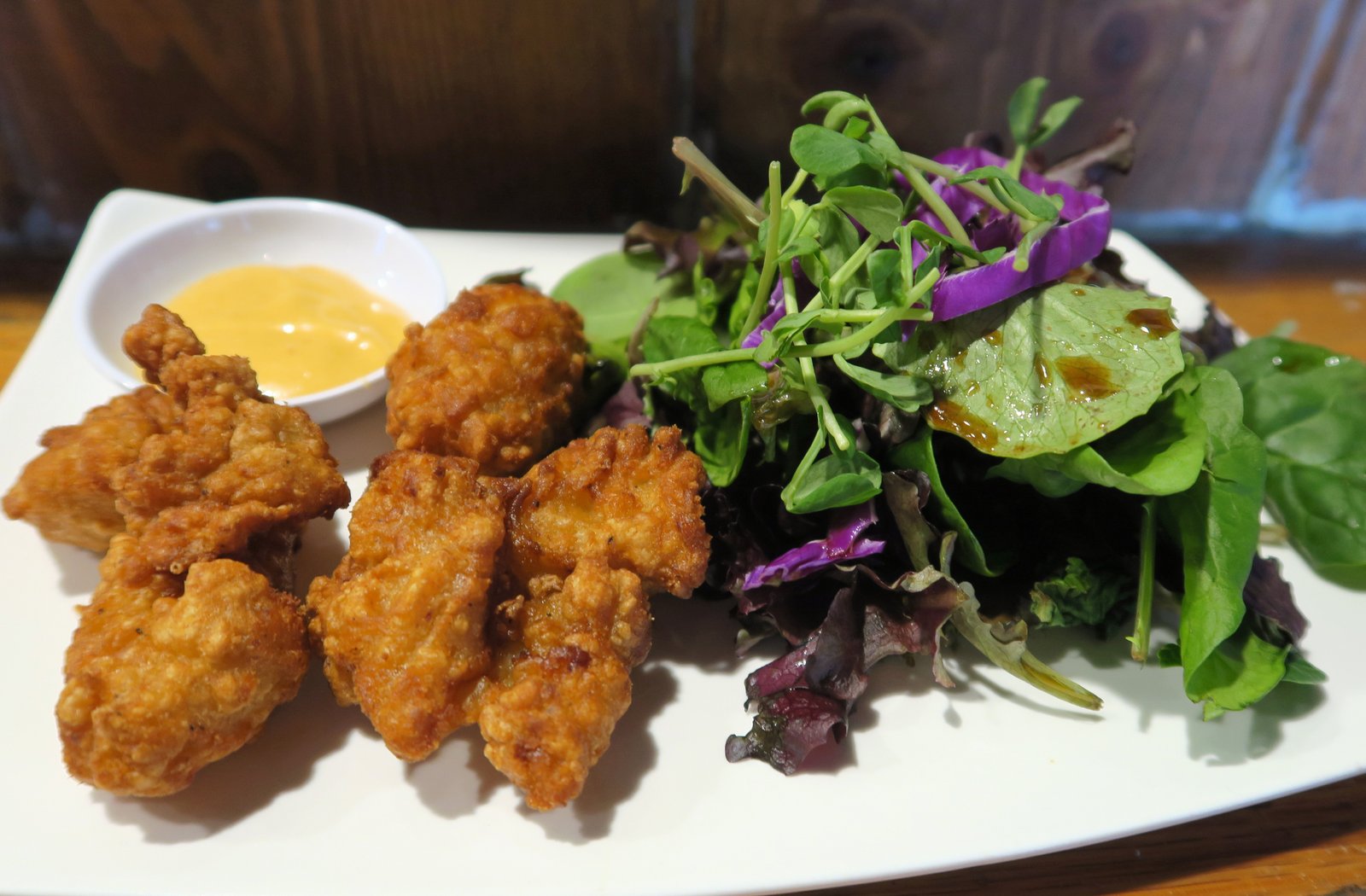 Soon enough the karaage and salad arrived. The karaage was strangely lukewarm in the center and really needed a flavor boost as it was really bland. It was slightly crisp.