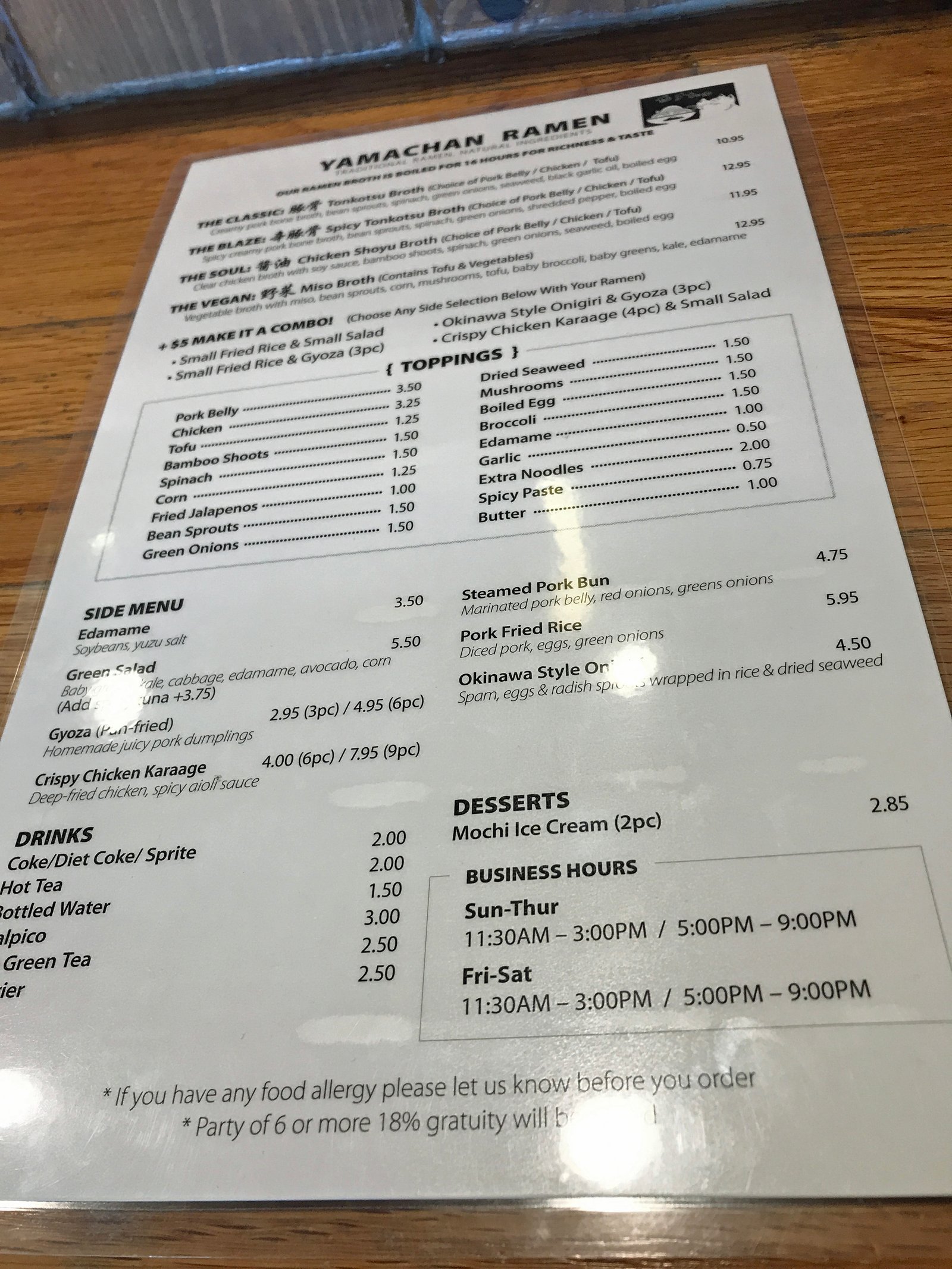 The menu is simple and to the point; Tonkotsu, Spicy Tonkotsu, Miso, and Shoyu (chicken based). Additional toppings and a few sides, something called Okinawan Onigiri; basically Spam Musubi, Gyoza (note to staff: discretion might help…as in don't make it so obvious you're serving packaged frozen gyoza….I saw you bring out those two red bags out of the freezer), and such.