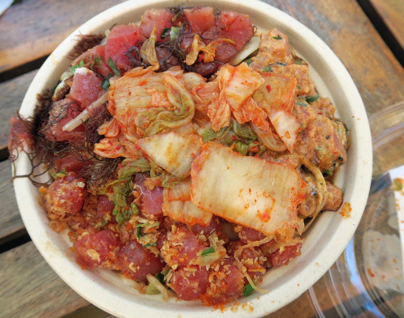 They even threw some kimchi on top for the Missus! The spicy mayo had too much mayo for me; but the limu poke had a good amount of ogo, wasn't too salty, the fish was decent quality. The shoyu poke wasn't drenched in shoyu and was quite good. Like I said, enough for the two of us. For some reason, the nutty brown rice goes pretty well with poke….ok, there; I've said it.