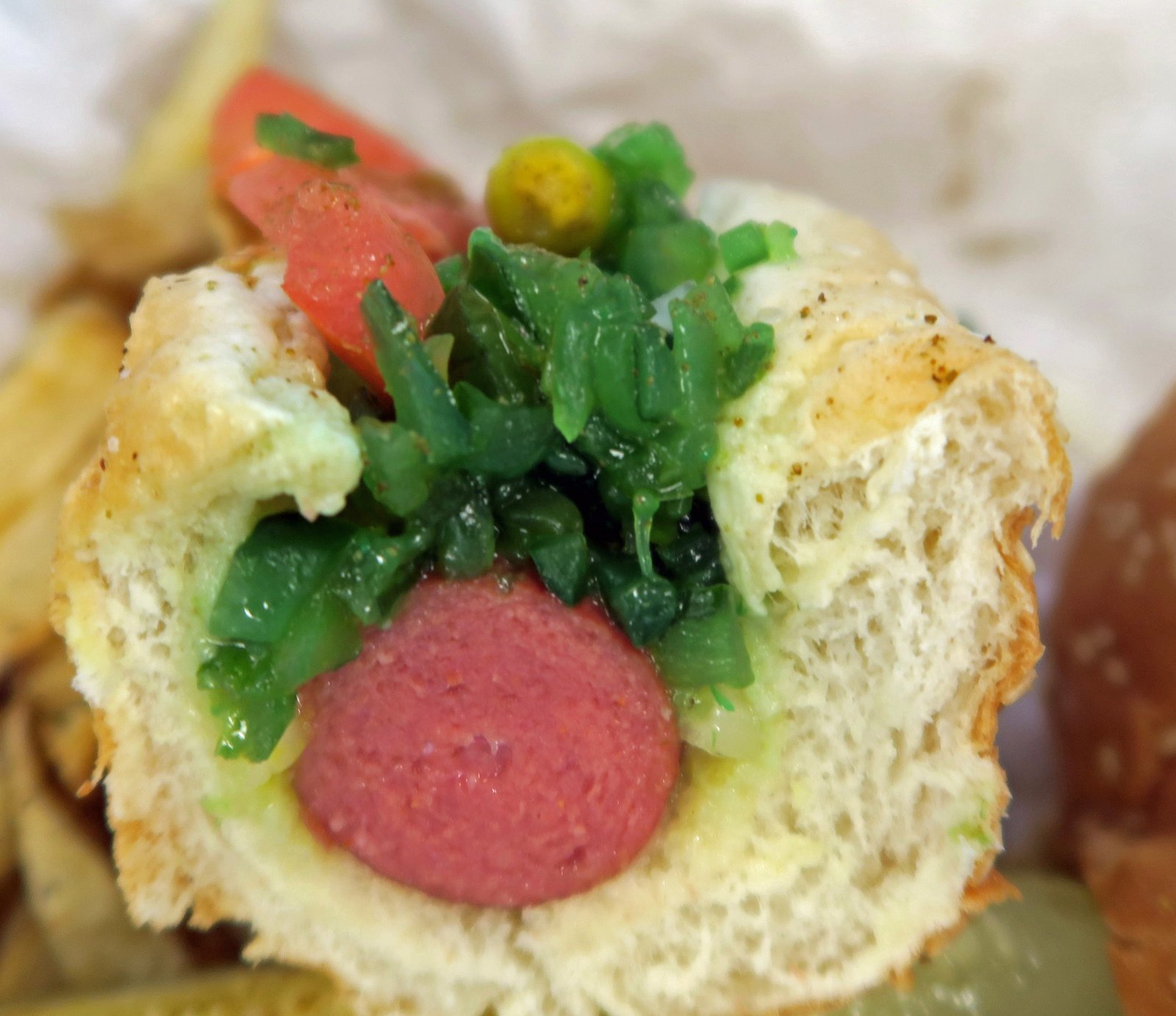 This place has gotten better over time. The roll, while not being the classic "S Rosen Mary Ann Poppy Seed Bun" was less crumbly and not as dry as usual. It was "dragged through the garden" in the typical Vienna Beef style; with all the typical players in place….fluorescent green relish? Check. Sport Peppers? Check. Celery Salt? A nice amount. Tomatoes? A bit riper than usual. The typical Vienna Beef dog had a decent snap as well.