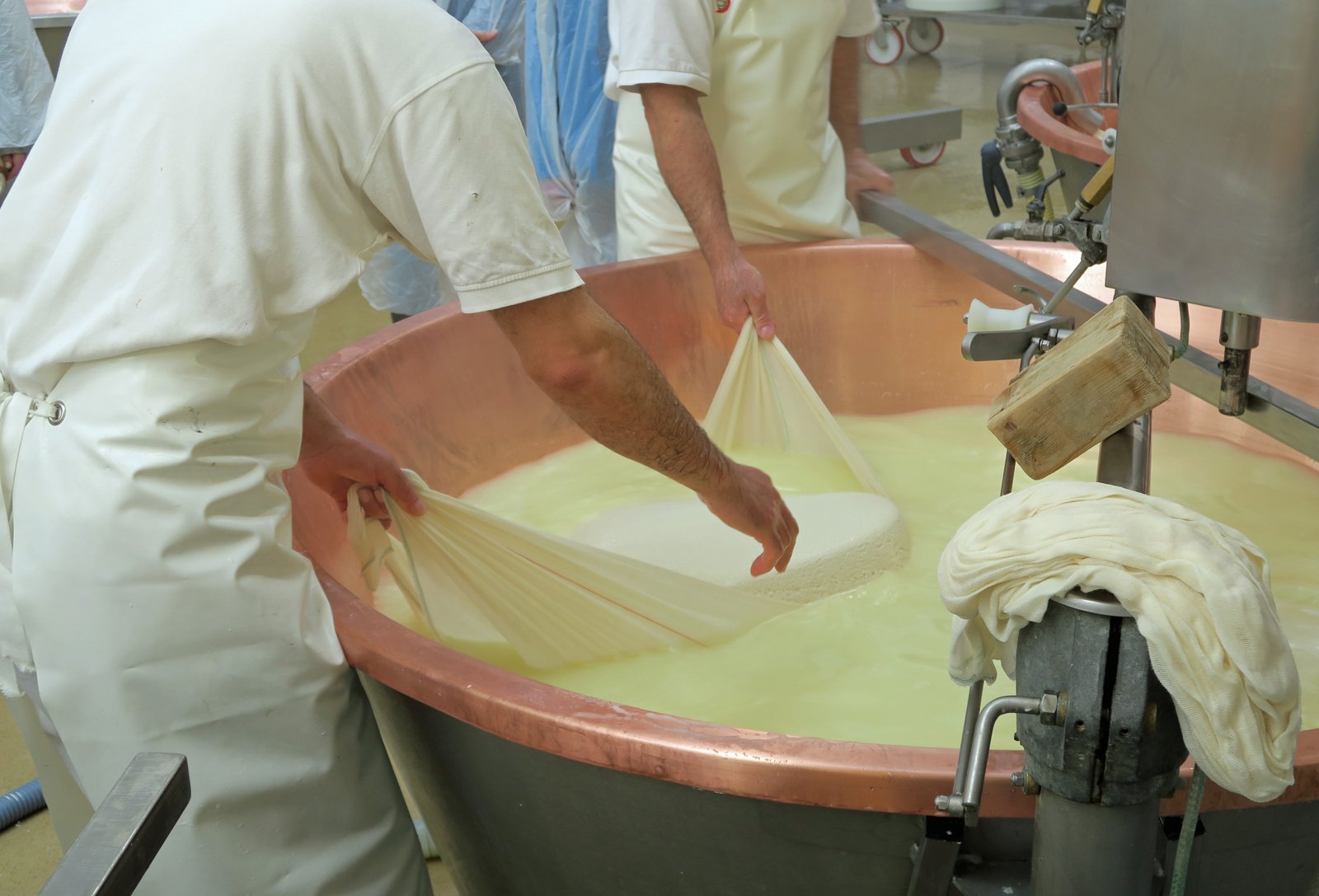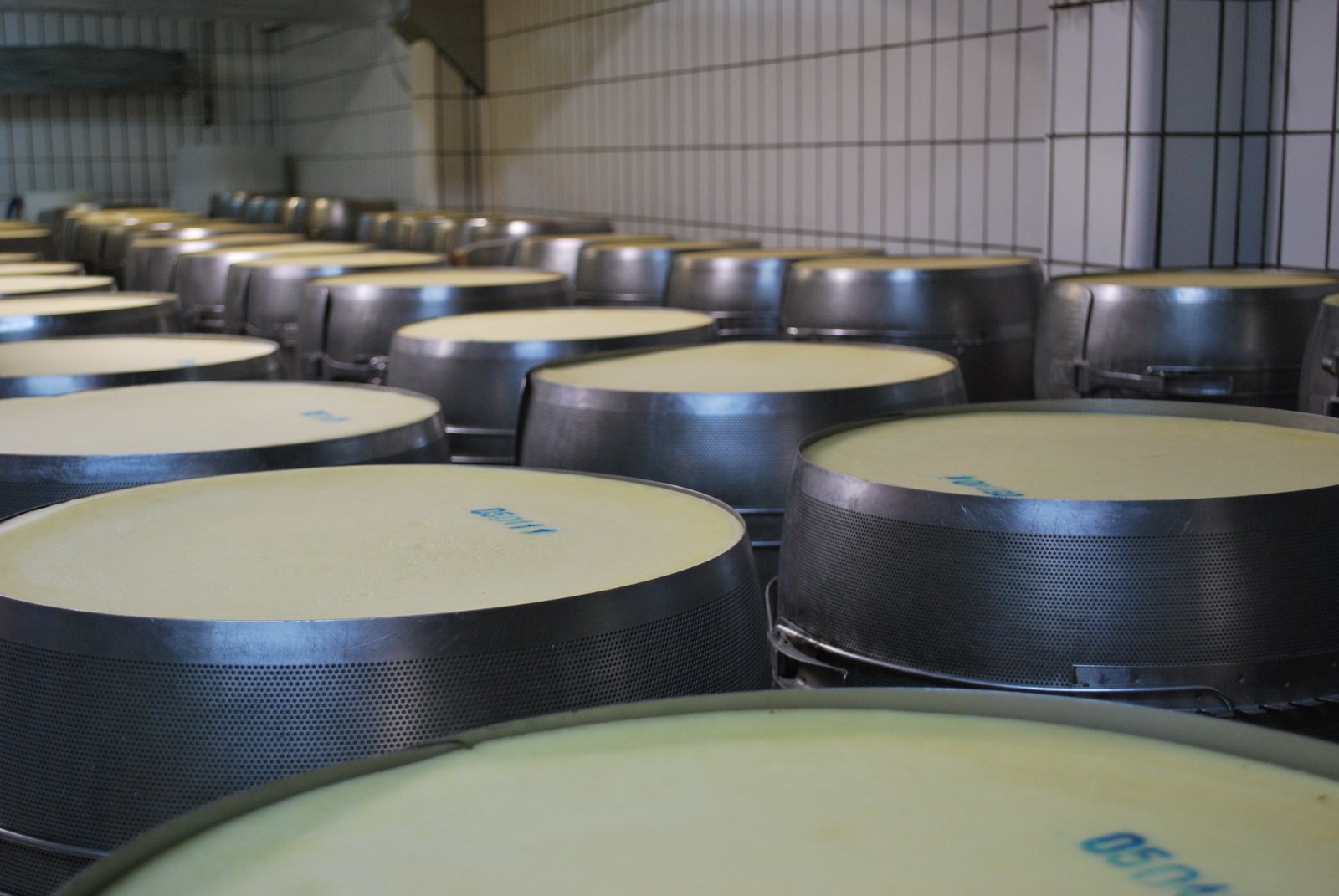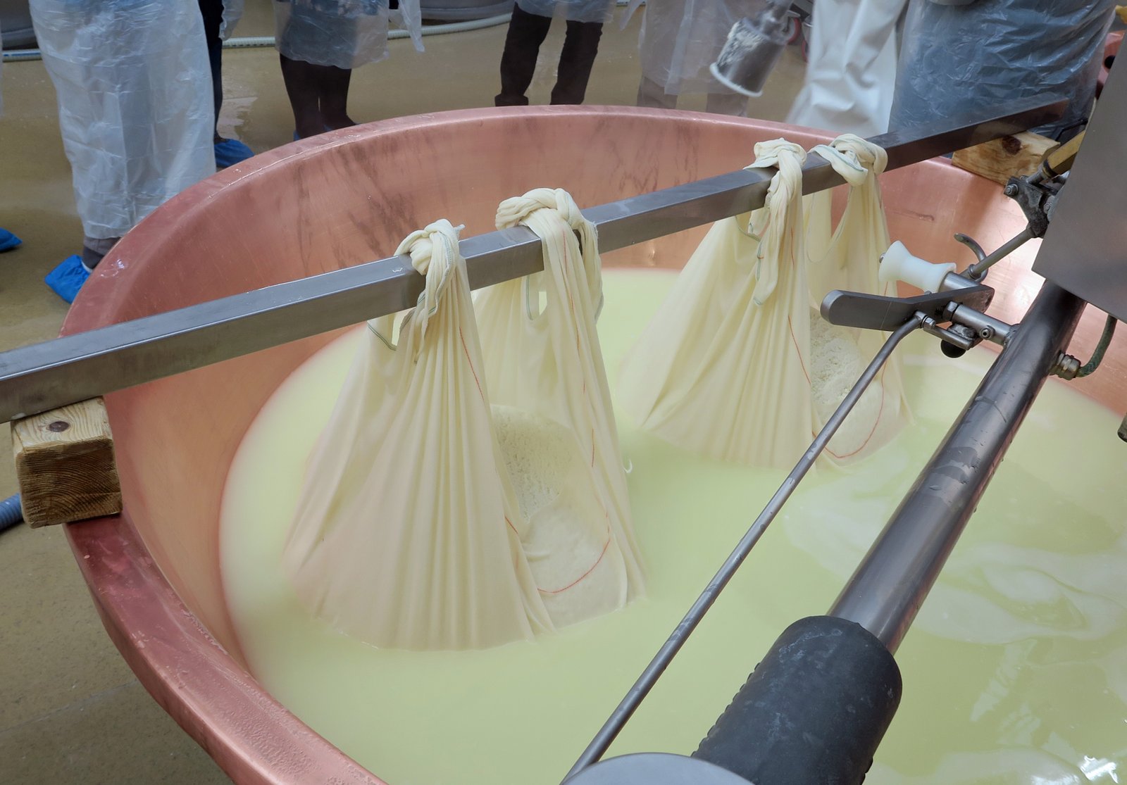 Each vat holds 1100 liters; that's 290 gallons of milk. From which the curds makes…..