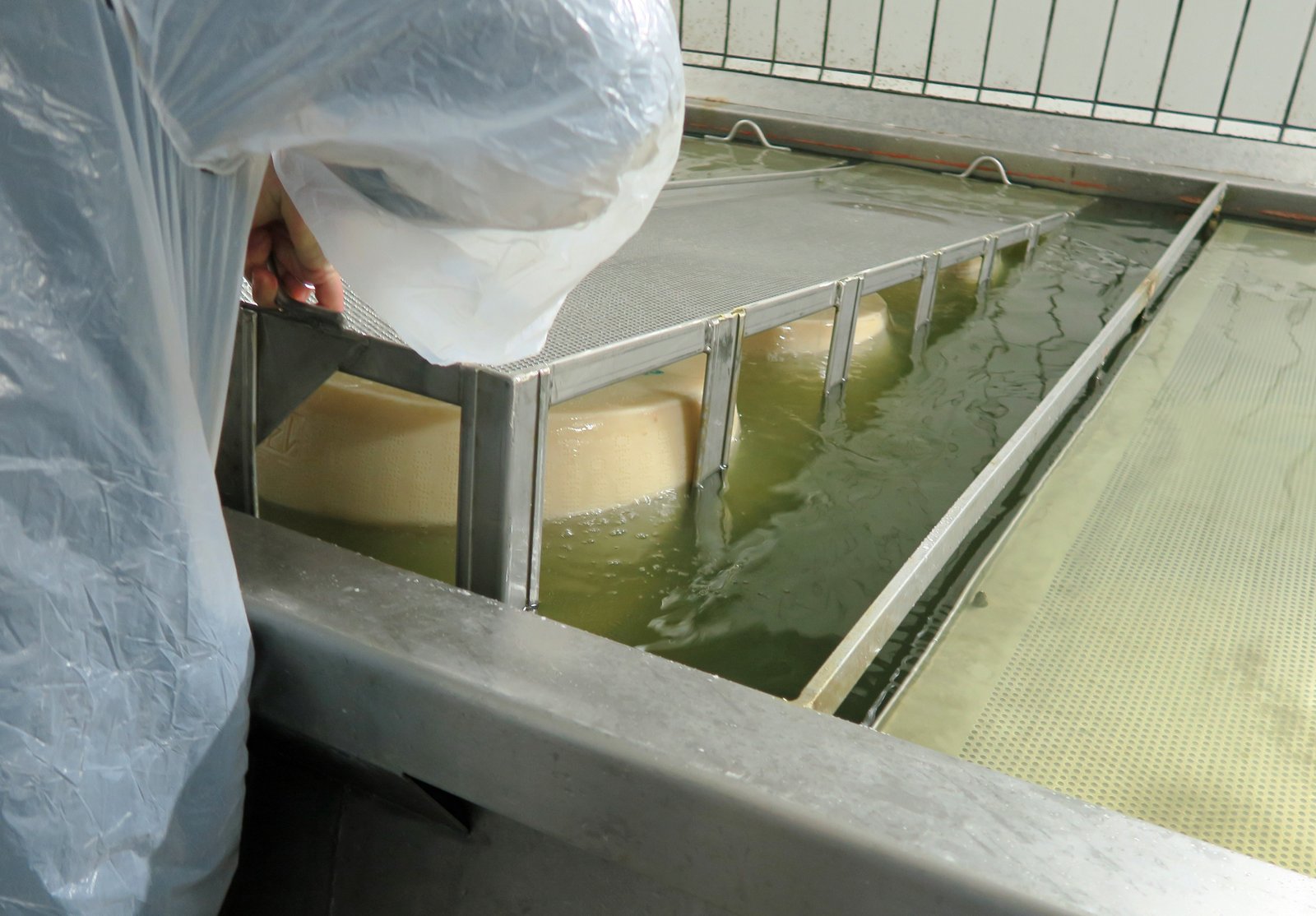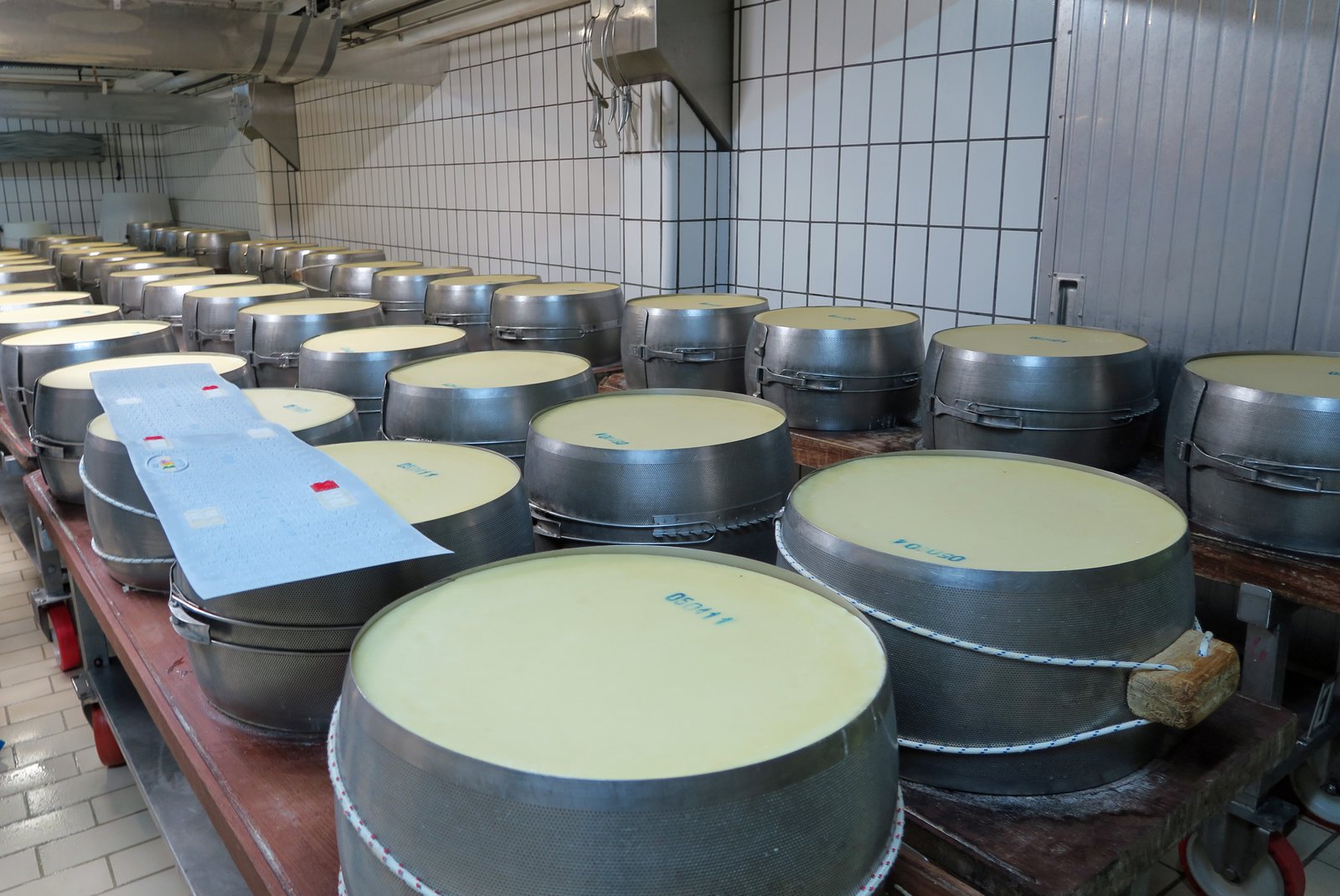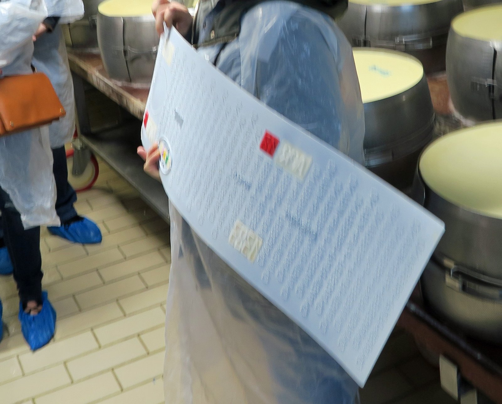 The cheese rests for a couple of days. A band is placed inside the molds which have the distinctive marks; the number of the producer, the month and year of production. The cheese also has a specific ID number; this way the actual cheese can be tracked back to the dairy which produced the milk. Only one dairy's milk is used for each production, so things can be traced.