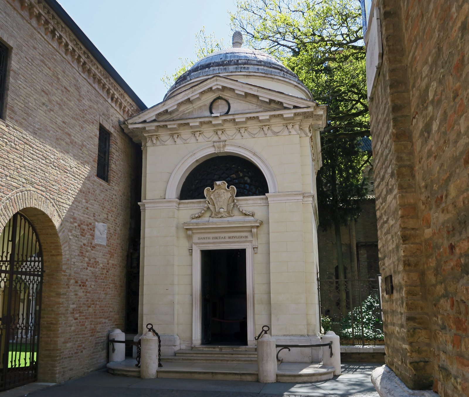 We'd gone a street too far. We would return here to visit the Basilica di San Francesco later on….there's something really cool in the church. But for now, I was focused on this place right around the corner in an area called "Zona del Silenzio" (Area of Silence).  Remember when we visited the Basilica di Santa Croce in Florence? I noted that Dante's tomb "monument" was located in the church, but he wasn't interred there? Well, here he is.