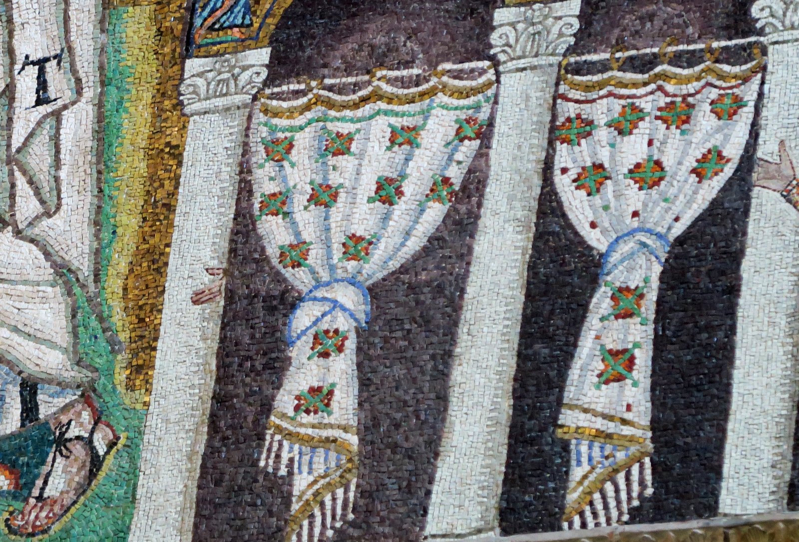 Well, it means that somebody else was in power. In 561 the church was deconsecrated as a Orthodox Christian Church. This end of the mosaic featured Theoderic and his court looking grand and powerful….well, that was just not going to do with Justinian in power would it? So Bishop Agnellus had him basically "blacked out" (Some things never change, do they?)…….but I guess working over those hands was going to be too much work?