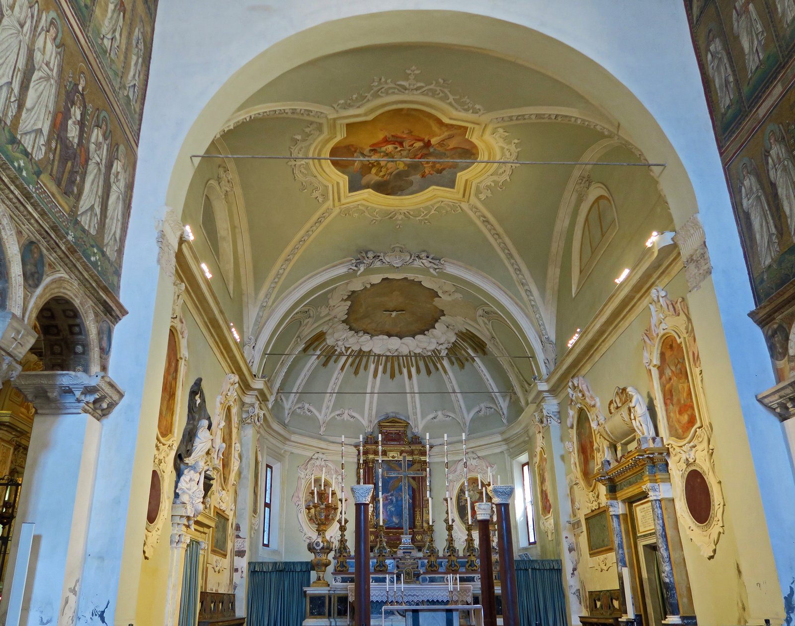 The interior is beautiful as mosaic friezes line each wall down to the apse.