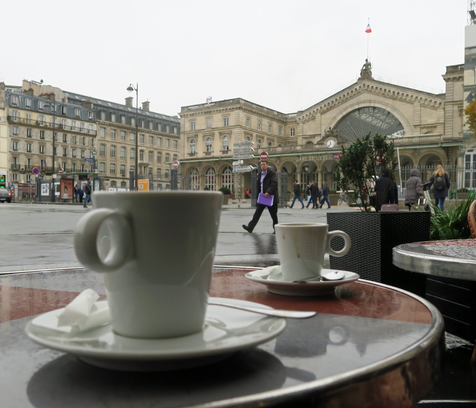 A few minutes later, we were ready to go. The La Tour-Maubourg metro station was basically a half block away. From there it was off to Gare L'est, which we had been to before. So we were familiar with the lay-out. Having a bit of time before our train, we walked to the café across the street and did the "Parisian thing".