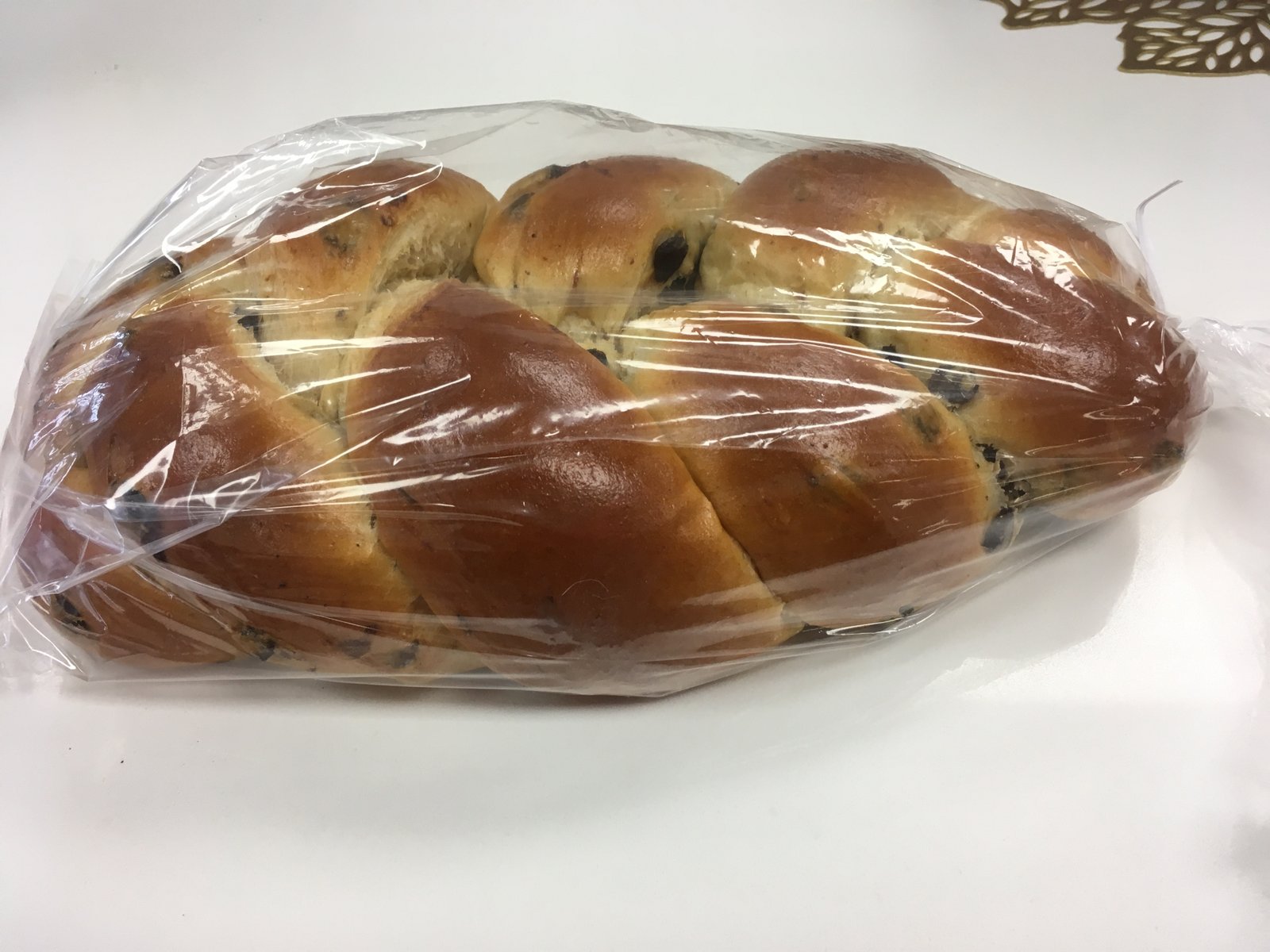 On this visit I did grab a loaf of raisin cHalla to go (it's Challah; a 1.8 lb loaf ($8)). This Jewish egg bread is always a favorite for The Mister and I at home; just with butter, sometimes toasted and occasionally made into French toast.