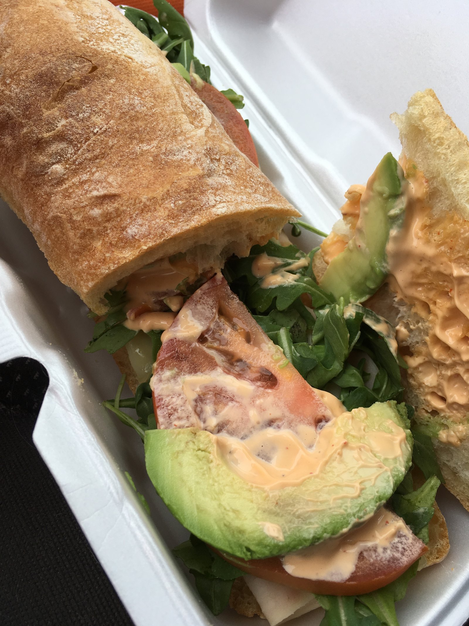 One of the sandwiches this day was turkey, on a (fresh baked) ciabatta loaf ($6.75). A good quality turkey, Swiss, arugula, tomato, avocado and spicy aioli was just the right size and combination of flavors to satisfy. I brought half home for The Mister and we will be going back soon.