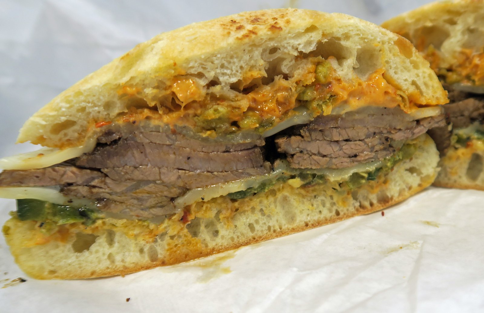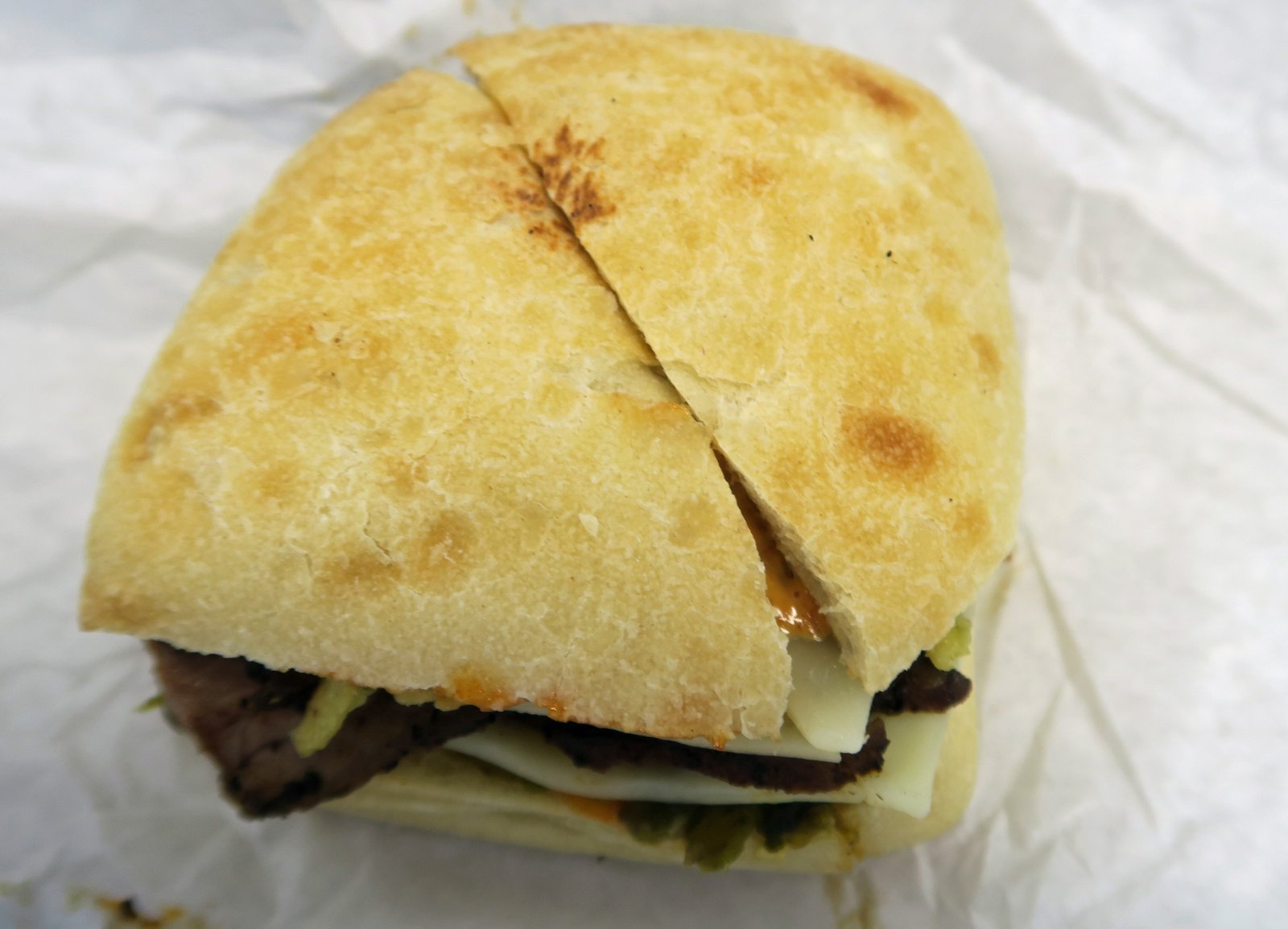 In many ways; this was a better sandwich. I had ordered the "Fuego" and in retrospect I should have gone with the "OG" to really compare. But, the standard issue ciabatta had been heated on the griddle and was still warm as I opened the sandwich at my desk. As was the meat. There seemed to be more tri-tip on this sandwich than on the previous version I had. It was moist and very tender. It was hard making out the seasoning on the beef since all the peppers and the chipotle mayo; which had a bit of kick really over-powered the sandwich.