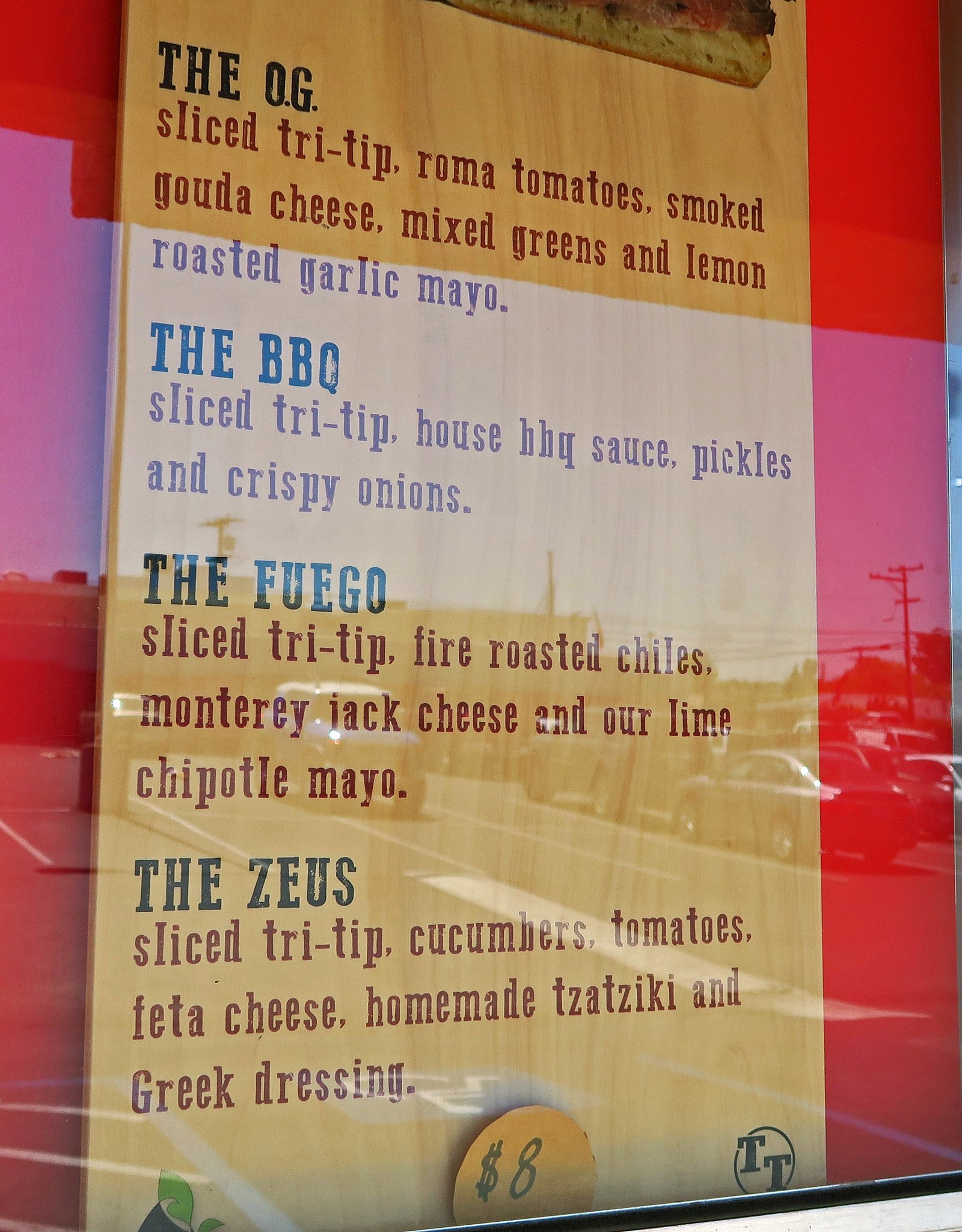 I took a quick look at the hours and saw Monday to Friday noon to four pm. This was a weekend, so they weren't open. Still, I took a quick look at the posted menu and noticed that the Tri-Tip sandwich I'd had before was now called the "OG" and had three other versions available. Along with the four sandwiches, there were three salads on the menu and that was it. The tri-tip I'd had here before had been decent, so I made a mental note to return.