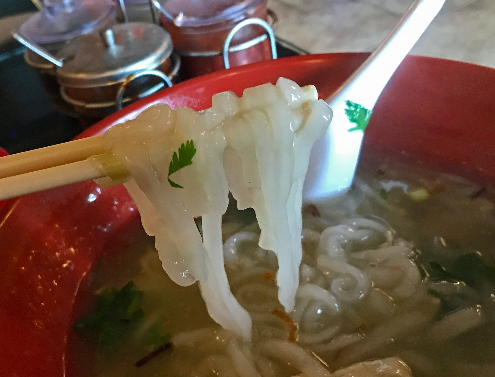 In many versions; like this one, the tapioca starch isn't dusted from the noodles and thickens the simple broth. This creates a rather thick soup….this one was perhaps the thickest I'd had in a while, almost like a potage. It was super hot and the density of the broth meant that it stayed lip singing hot for the entire meal. The noodles had a nice chew to them. The flavoring of the broth was very simple; I'm used to having more cilantro and perhaps lemongrass notes; but this one was fine. As I had figured; the chicken, it was white meat was dry and tasteless. But let me tell you, because of the viscosity, this is pretty filling.