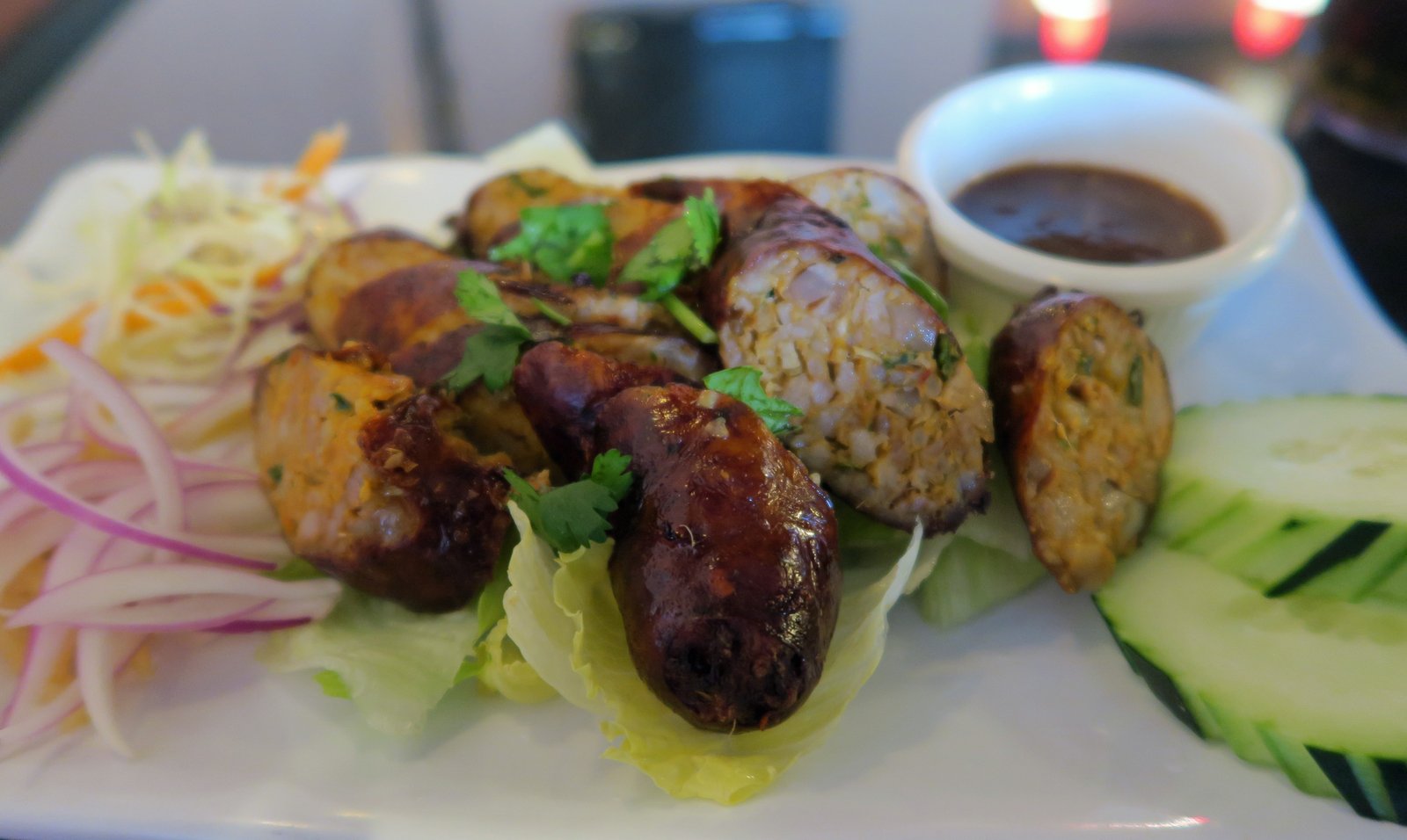 Lovely, slightly sour porkiness, nice lemongrass – kaffir lime leaf – gingery tones, a hint of spice. The rice in the sausage gives it a wonderful texture and every time I've had this here, the sausage casing had been crisped up nicely. As I've before; that tamarind based sauce really isn't needed for this.
