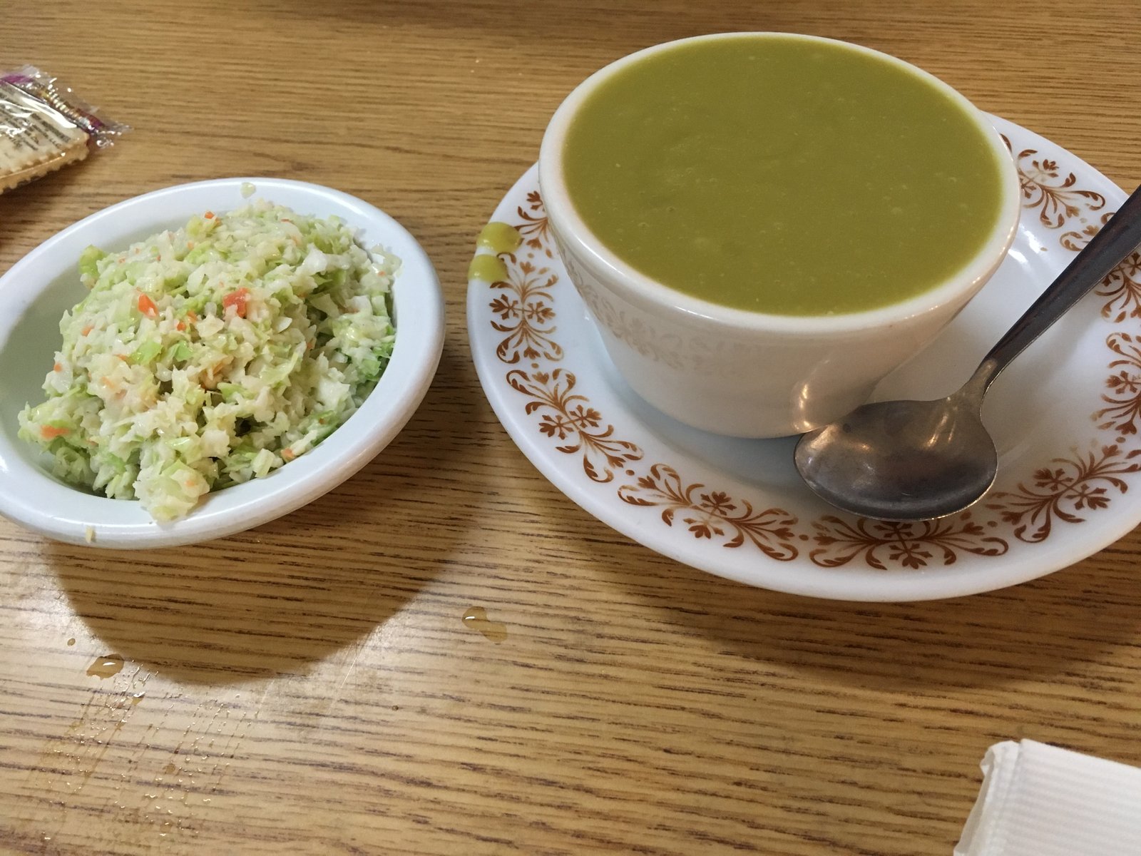 There are tabletop 'specials' which include soup and Cole slaw. (Of note, the pea soup here is vegetarian; no ham).