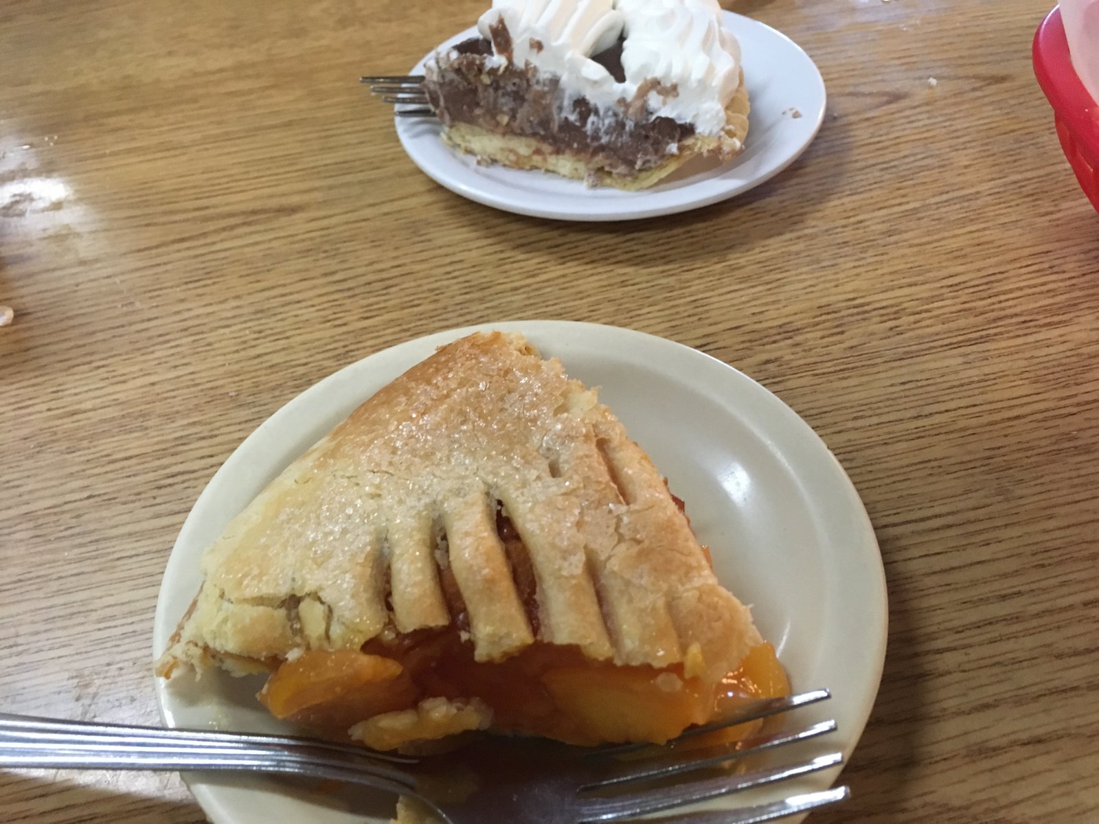 Full meals are served with a choice of pie for dessert. This day, chocolate pie and peach pie were chosen. Again, the hose made crusts make this so wonderful…light and flaky and so very fresh.