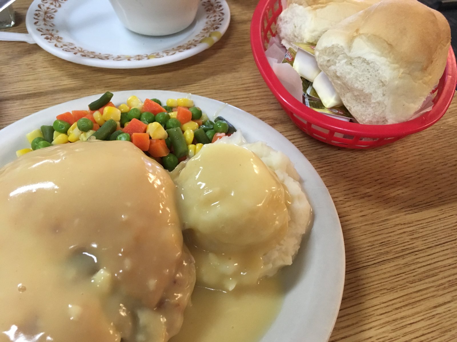 The Pie Dinner (still $10) which also arrives with the finely chopped slaw and fresh, chewy, wonderful dinner rolls is the same as always; a sturdy yet light crust surrounding chicken and turkey and gravy-no vegetables as filler. It's served with mashed potatoes and a Vegetable of the Day.