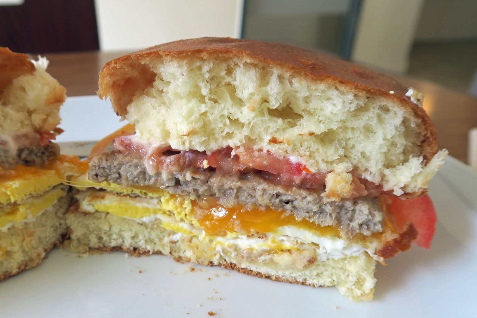 I decided on the Breakfast Sandwich #2 on the menu and feeling a bit hungry added on the sausage patty. I did ask to see if they'd make the eggs easy over; but I guess it's just too much to ask a Barista to make runny eggs.
