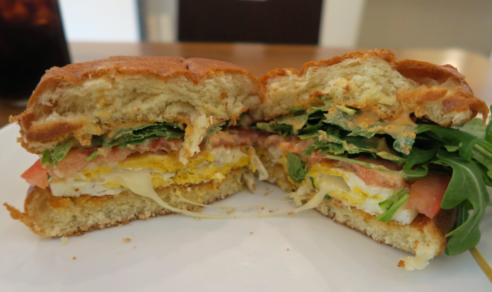 The Chipotle mayo added a nice bit of "zip", the peppery and slightly bitter arugula did well with the mayo, the mild sweetness of the roll, and the acidity of the tomato. And yes; I'd prefer a runny egg…..but I didn't dwell on that too much.