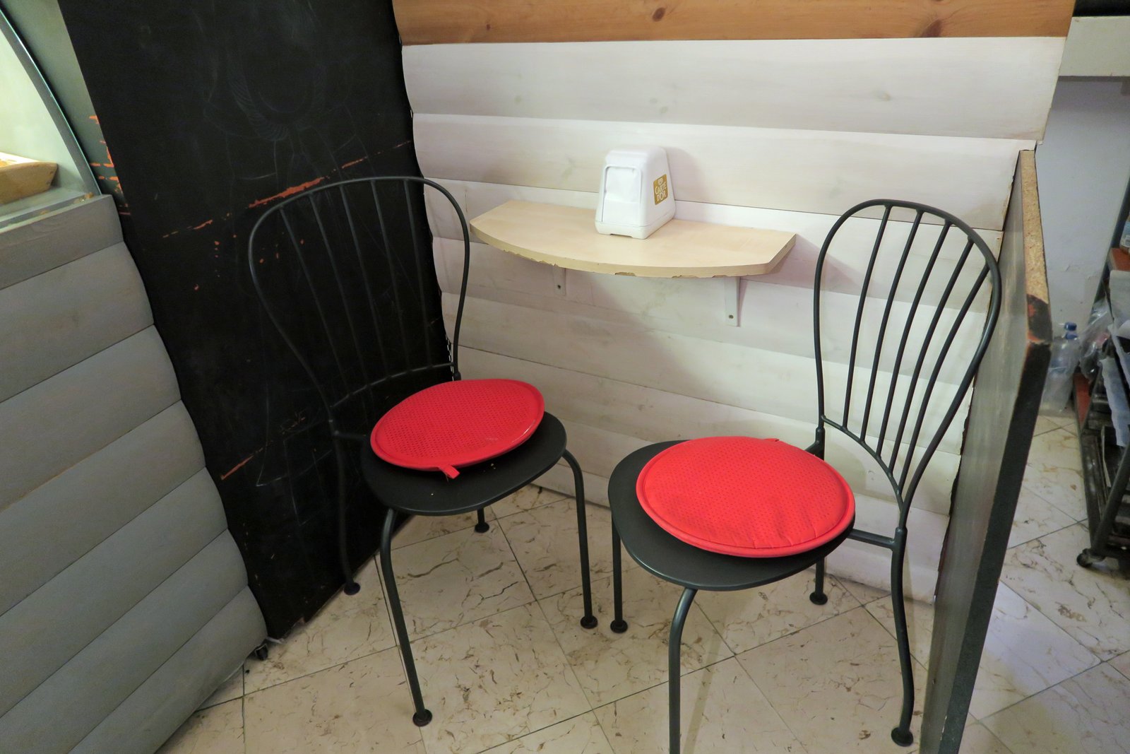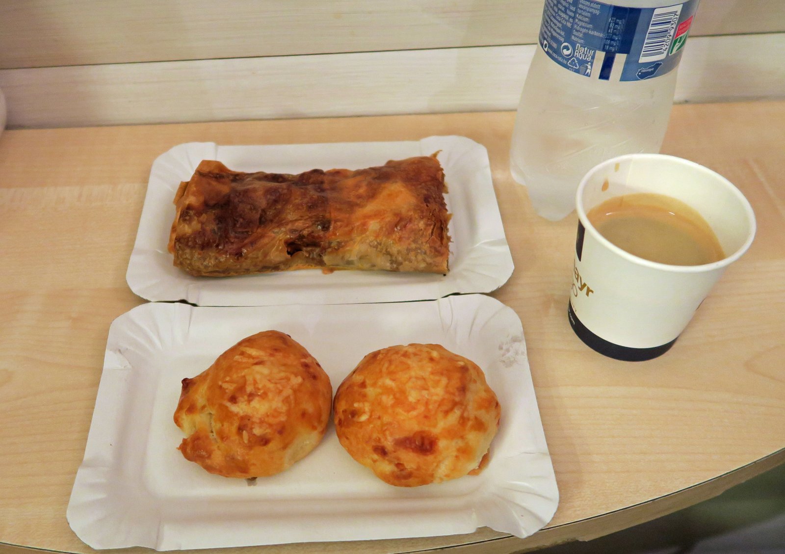 I ordered a savory strudel (Rétes) and a couple of the cheese "scones" (Pogácsa), along with some espresso and water. We had a seat at the tiny table.